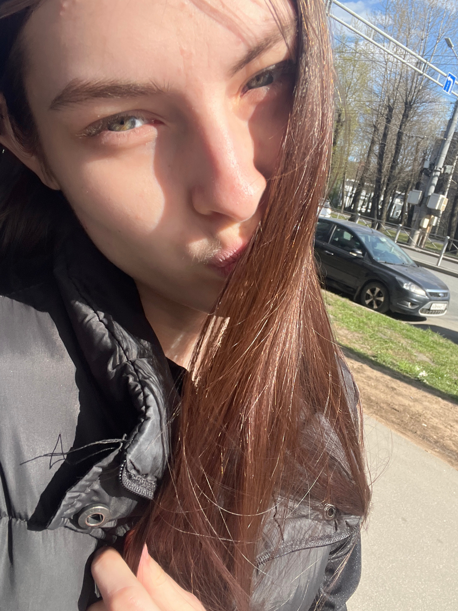 The image is an angled selfie of a young woman taken outdoors in what appears to be an urban or suburban environment in Saint Petersburg, Russia. The woman's face is prominent on the left side of the…read more
