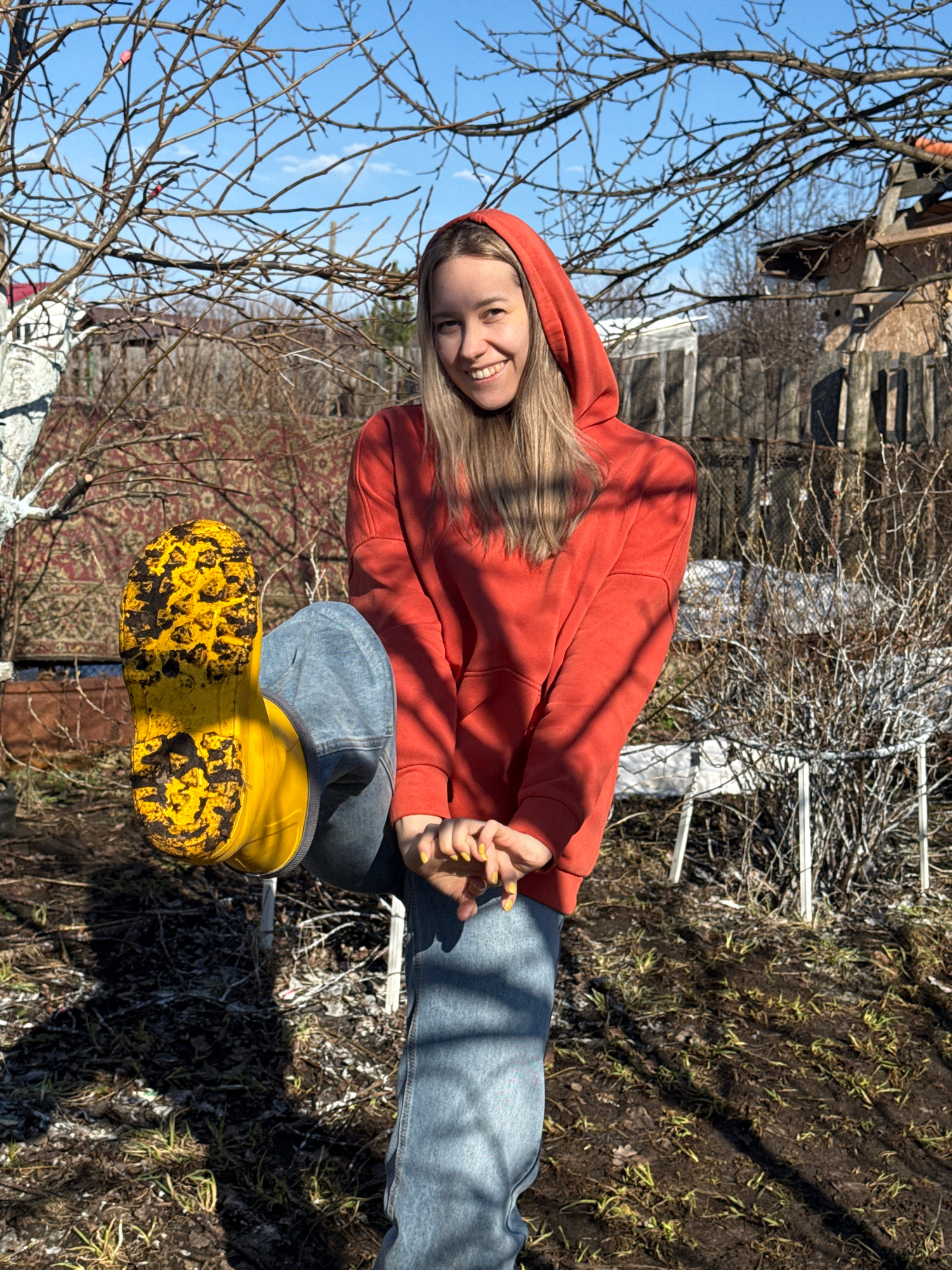 A young woman in an orange hoodie and blue jeans stands outdoors in Chaikovsky, Russia. She wears yellow rain boots caked with mud. The background includes bare trees and a glimpse of buildings, with…read more