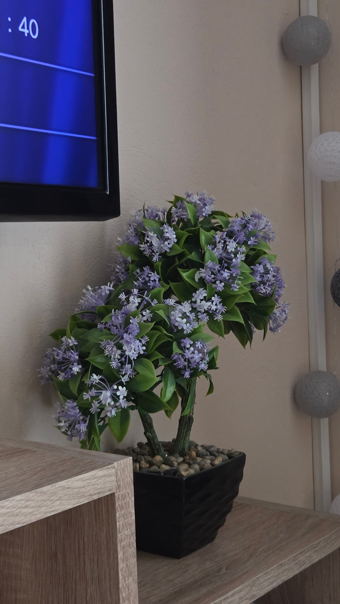 The image shows a display in an interior space, likely a home. A black-framed television screen is visible in the lower left corner with a blue display. Next to it, a decorative artificial flower arra…read more