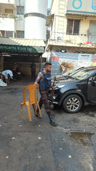 A police officer in uniform holds a rifle while carrying a tan plastic chair. He is standing on a street, next to a black car. Behind him is a garage or repair shop with people working inside. The bui…read more