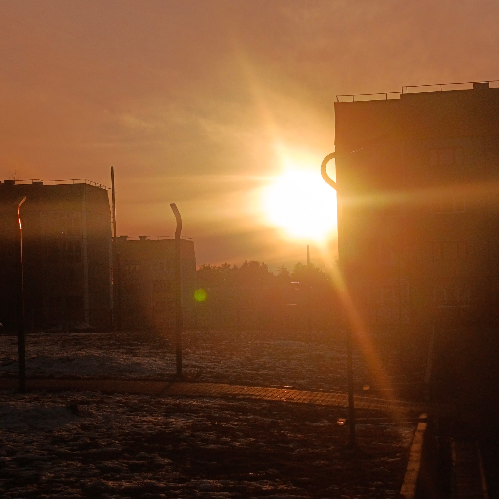 The image depicts a bright, possibly hazy sunset in Markovskii, Russia. Several buildings are visible, silhouetted against the light. In the foreground, there is ground covered in what appears to be aβ¦read more