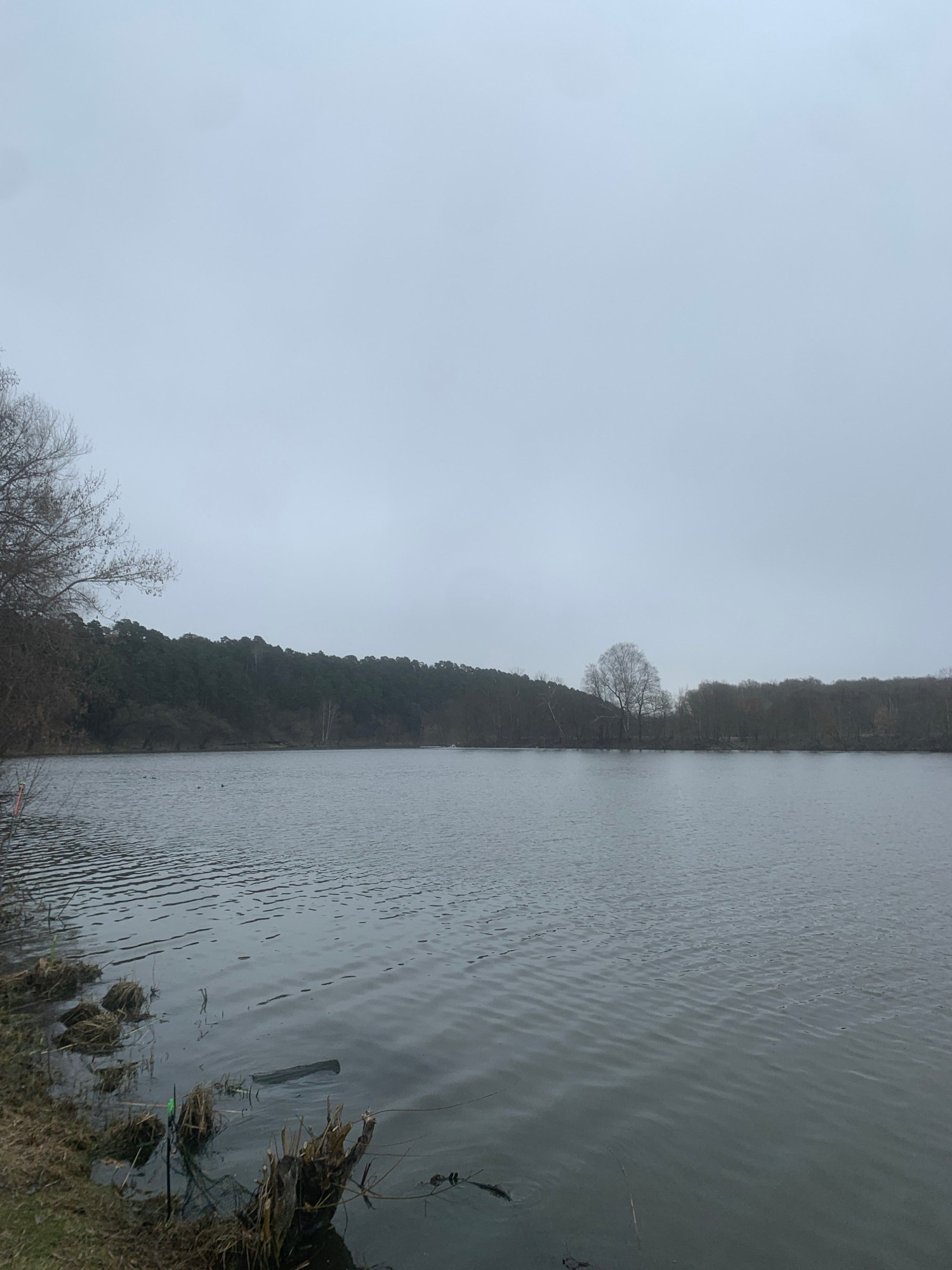 The photograph shows a body of water, possibly a lake or wide river, bordered by a wooded shoreline. The sky is overcast, suggesting a gloomy or rainy day. The water is calm with subtle ripples. Veget…read more