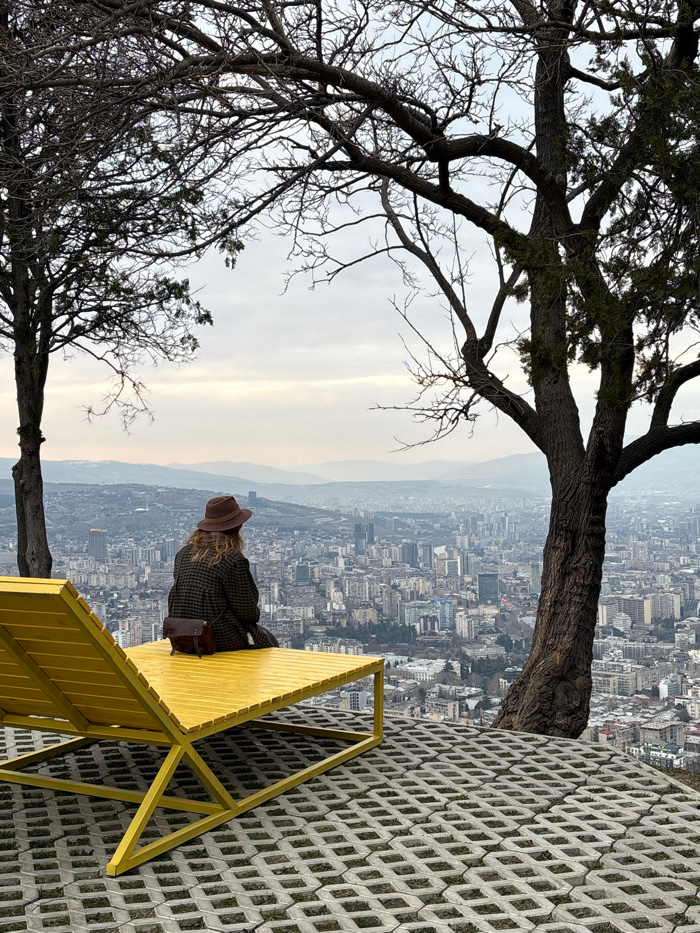 An individual is seated on a bright yellow, slatted outdoor lounge chair on a paved overlook, facing away from the camera and observing a panoramic view of the city of Tbilisi, Georgia. The person wea…read more