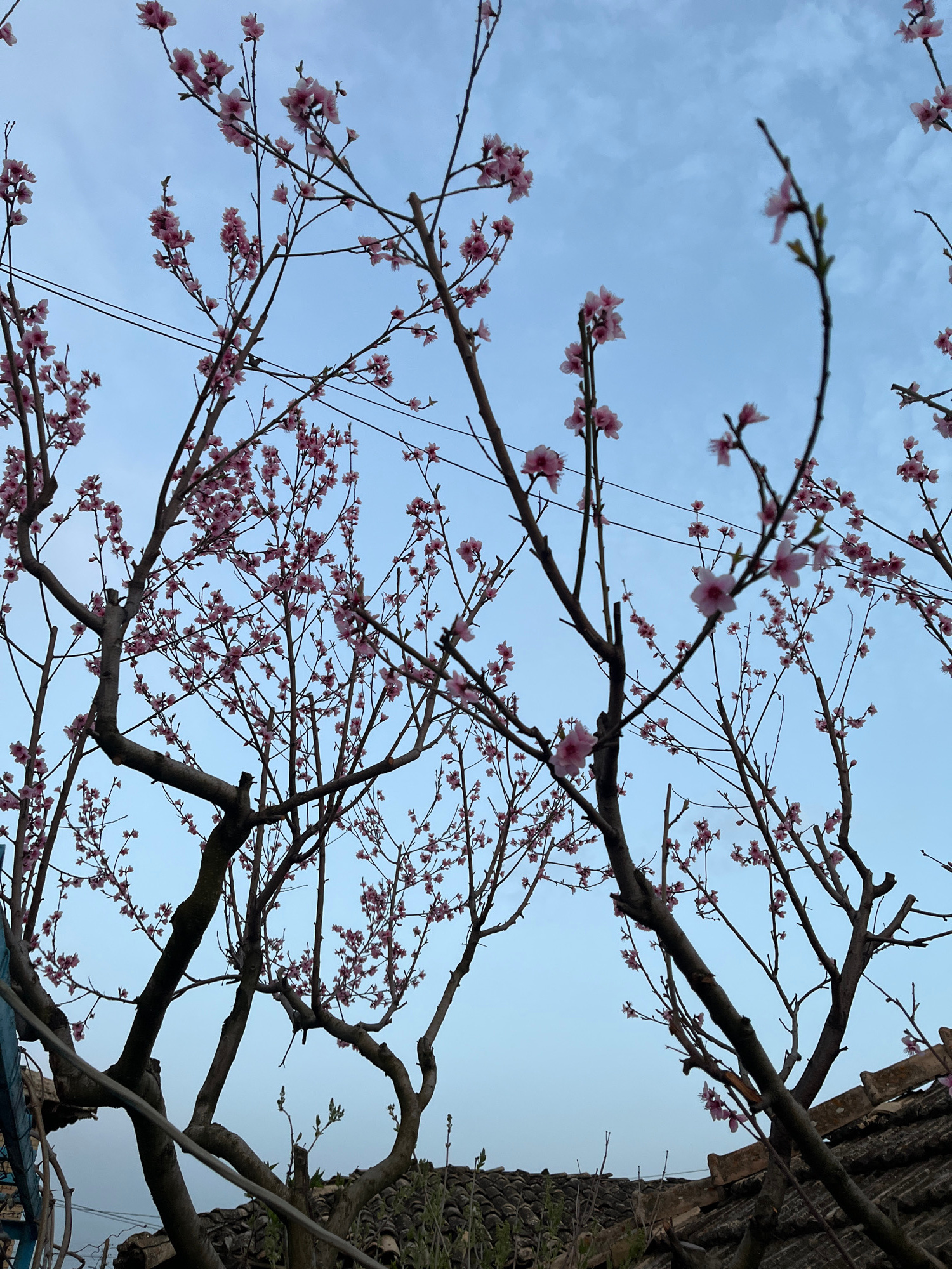 The image shows a view looking up into branches of a tree with pink blossoms against a pale blue sky, with faint clouds visible. On the right side of the frame, portions of a building or wall are visi…read more