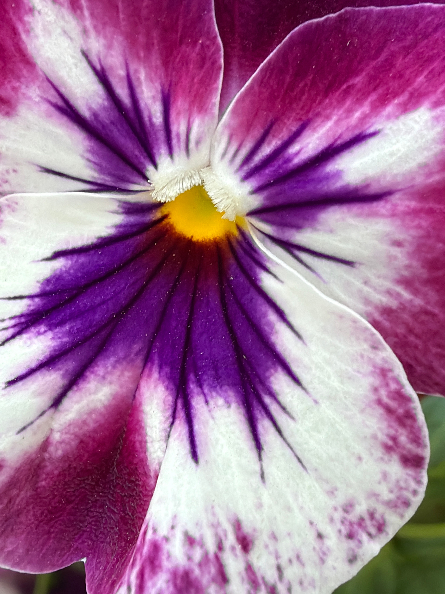 The image shows a close-up of a purple and white pansy flower. The petals exhibit a combination of solid purple, white, and striped patterns of purple radiating from the center. The center of the flow…read more