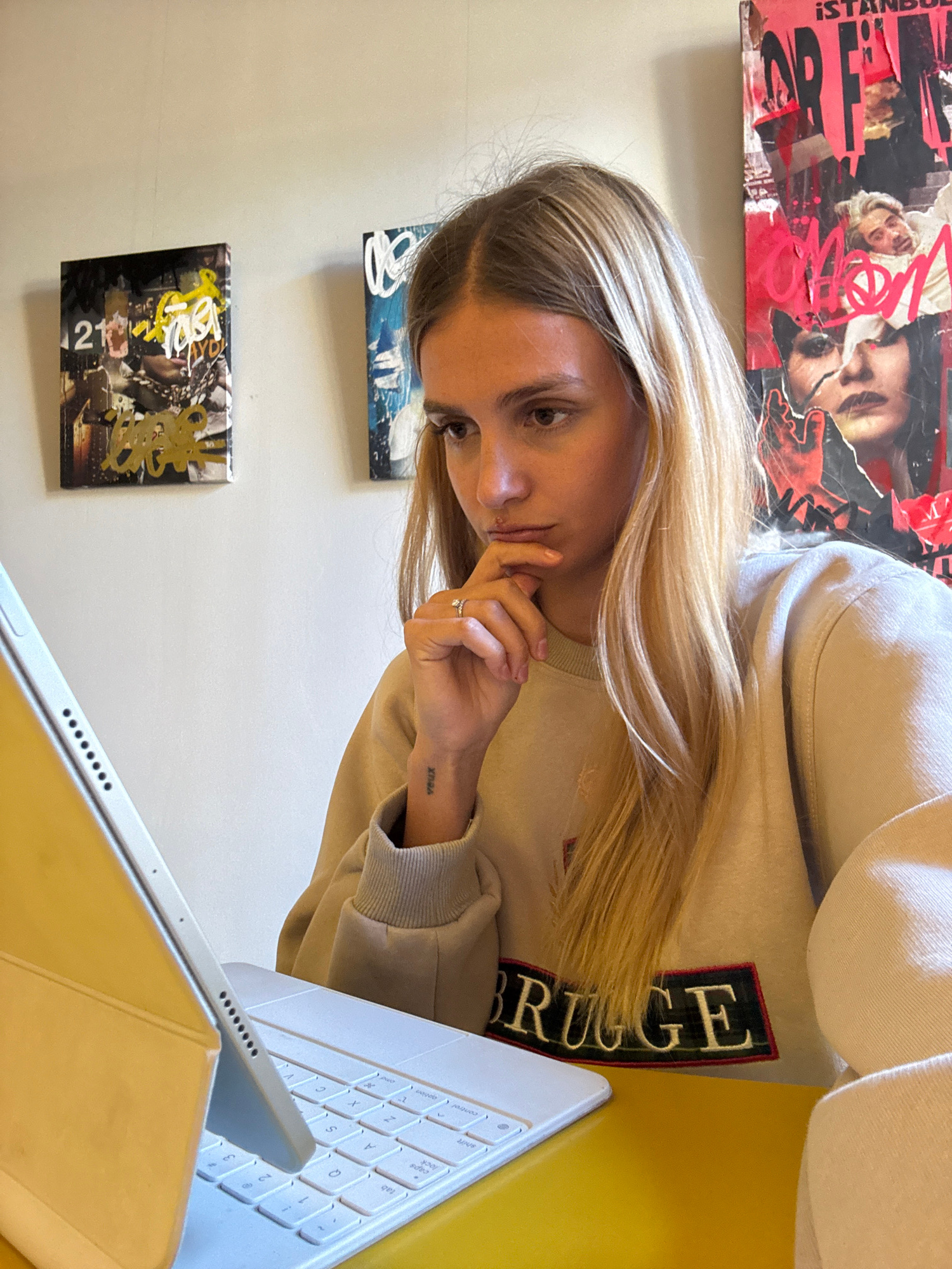 A woman with long blonde hair sits at a yellow desk, looking at a tablet computer. Her right hand is near her face, and she wears a tan sweater with "BRUGE" in large letters. On the wall behind her, t…read more