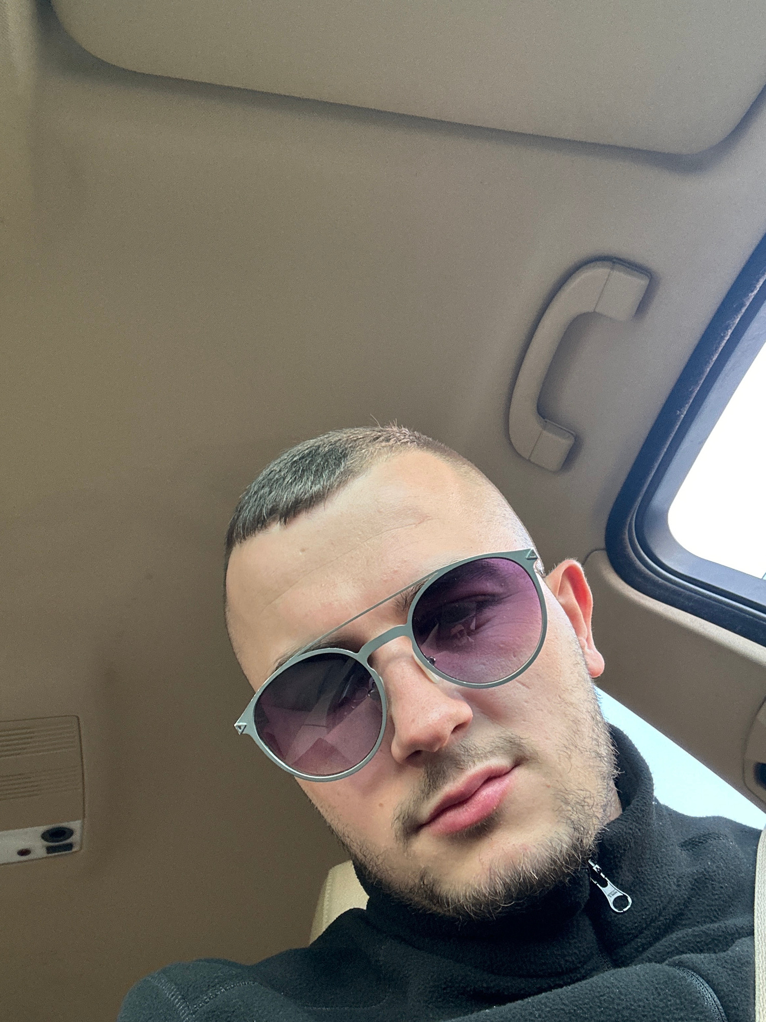 A man is inside a car in Plovdiv, Bulgaria. He is wearing a black jacket and sunglasses with round, purple-tinted lenses. The interior of the car is beige. There's a handle on the car's ceiling near t…read more