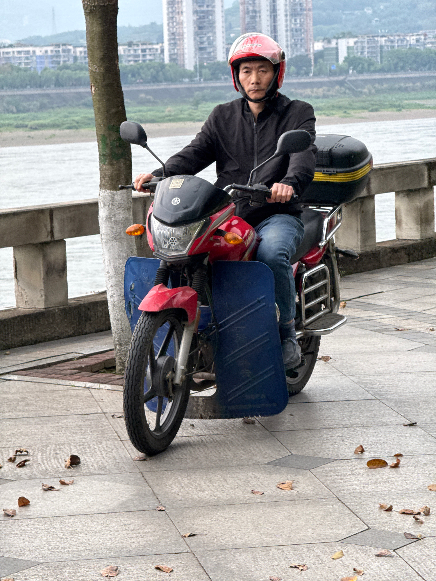 A man sits on a red and blue motorized tricycle. He wears a black jacket, blue jeans, gray shoes, and a red helmet with a white stripe. The vehicle has a black storage box mounted behind the seat. It…read more