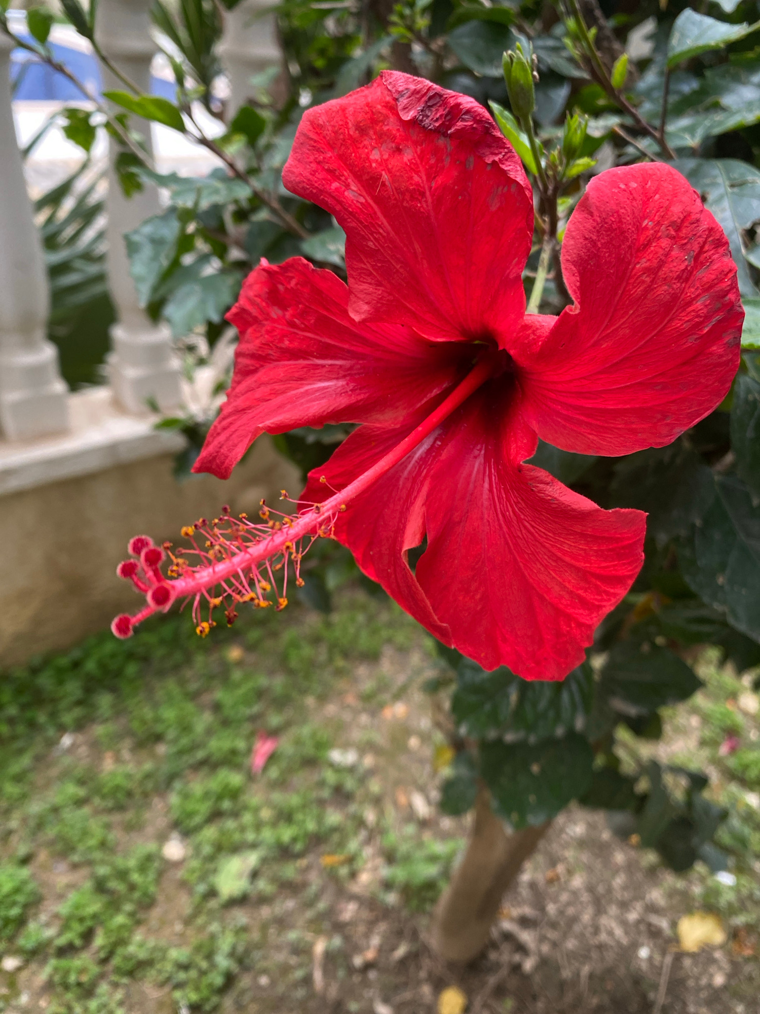 The image features a red hibiscus flower in full bloom. The flower has five prominent petals, exhibiting a vibrant red color. The petals show slight signs of wear and imperfections. Emerging from the…read more