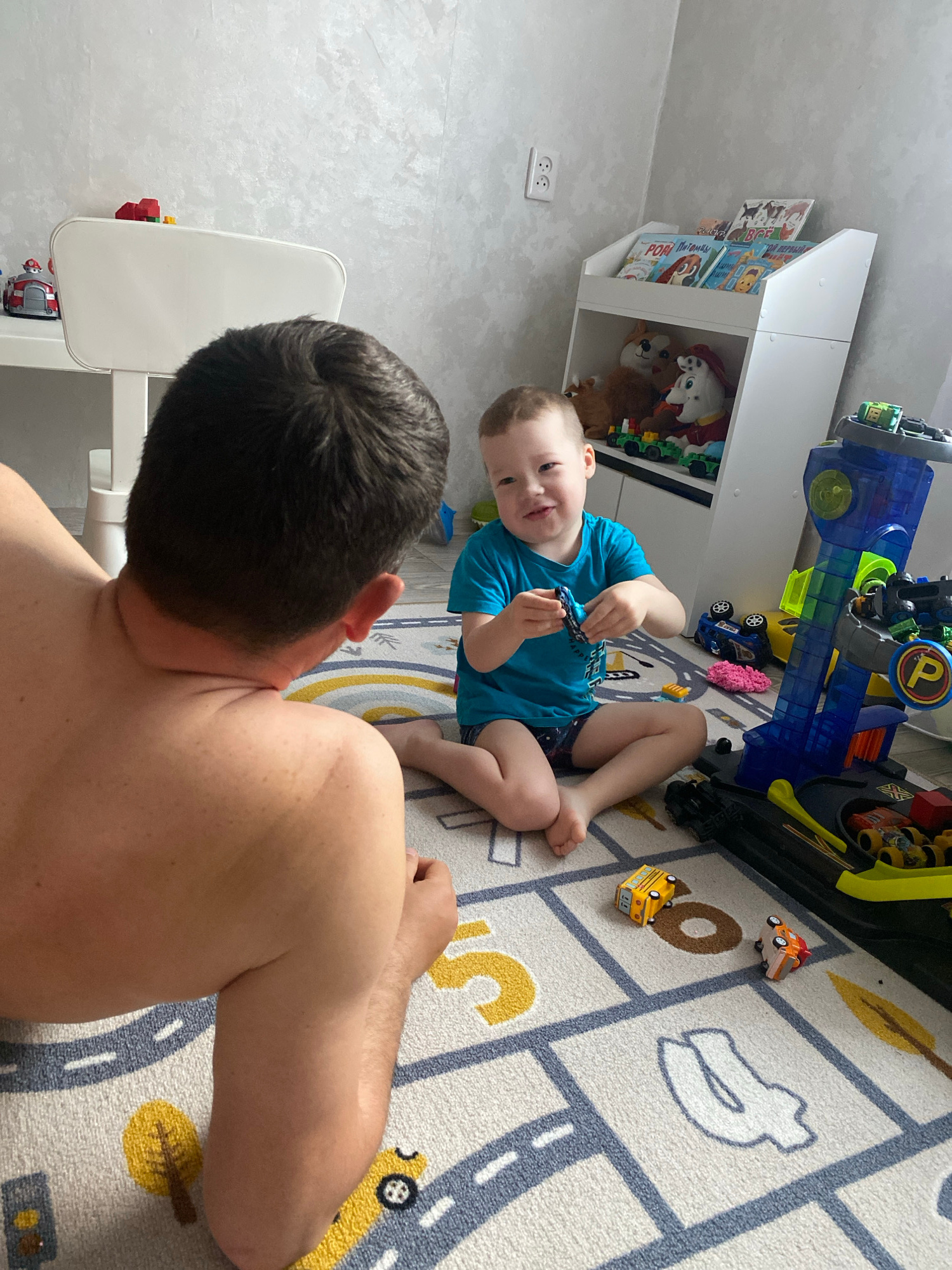 A wide-angle, indoor shot shows a child and an adult on a rug. The child, wearing a blue shirt, is sitting on the rug and holding a toy car. The rug has a pattern resembling streets. The adult is posi…read more