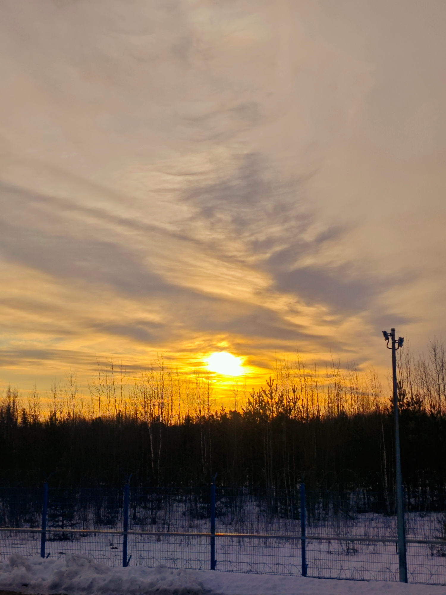 The image shows a winter sunset in what appears to be a restricted or industrial area near Unknown, Russia. A barbed wire fence in the foreground is covered in snow. Beyond the fence is a line of tree…read more