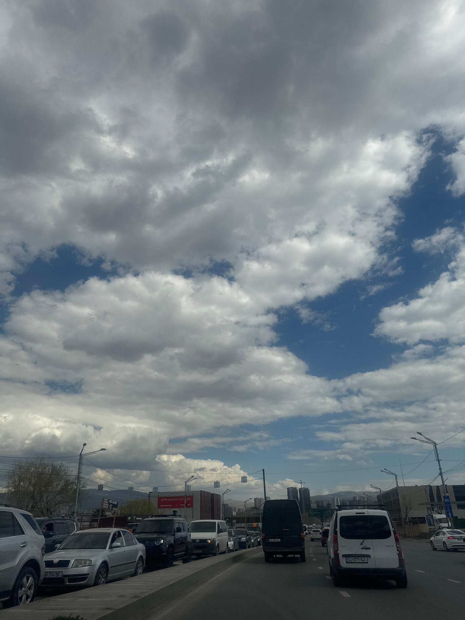 The image is a medium shot of a traffic jam in Tbilisi, Georgia, taken from a slightly elevated perspective. The view is mainly oriented towards the sky, filled with a mix of dense grey and white clou…read more