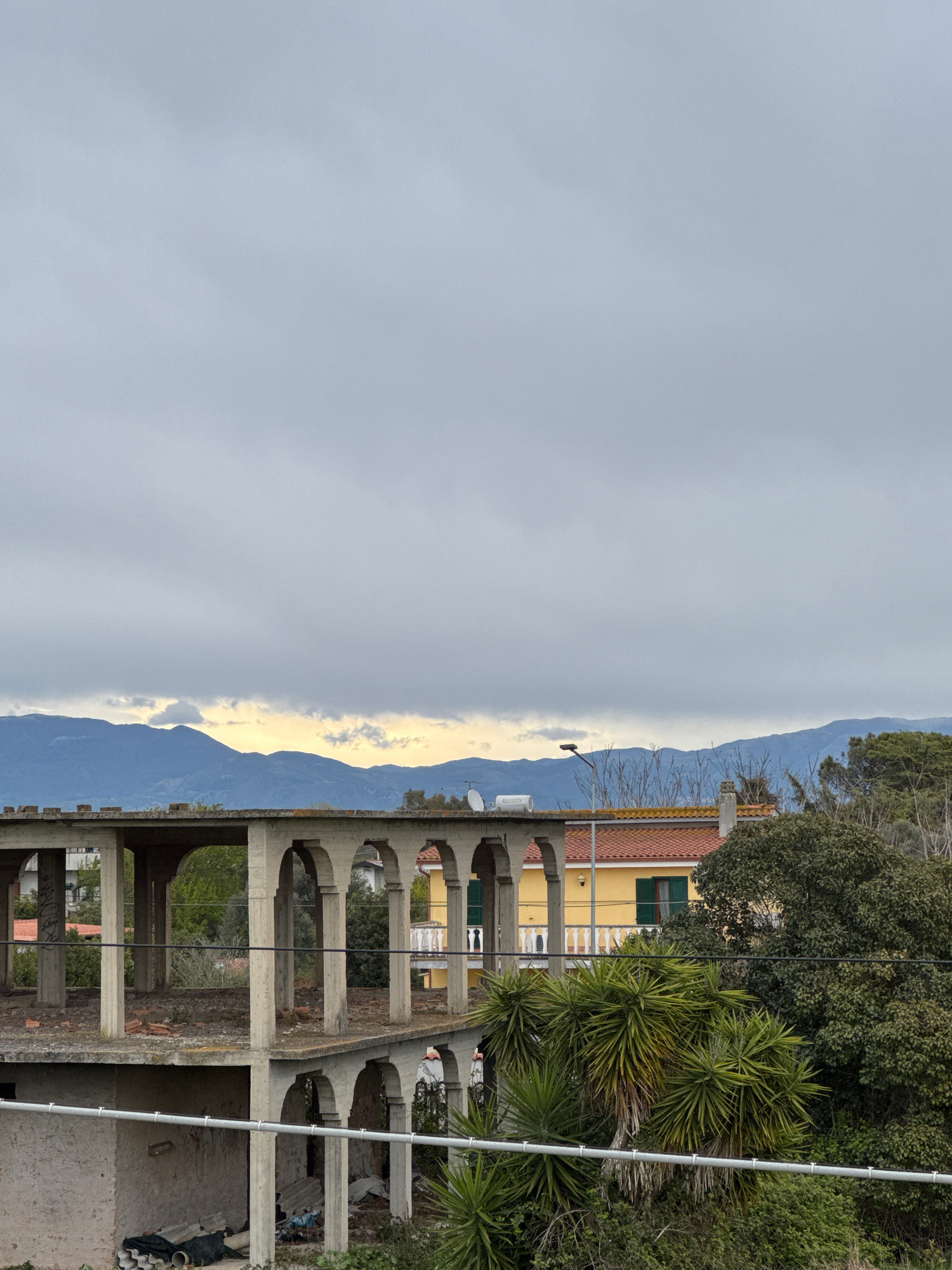 The image depicts a partial view of an unfinished, multi-story concrete structure with arched openings, situated in Aprilia, Italy. Behind the structure, mountains are visible under a cloudy sky. The…read more
