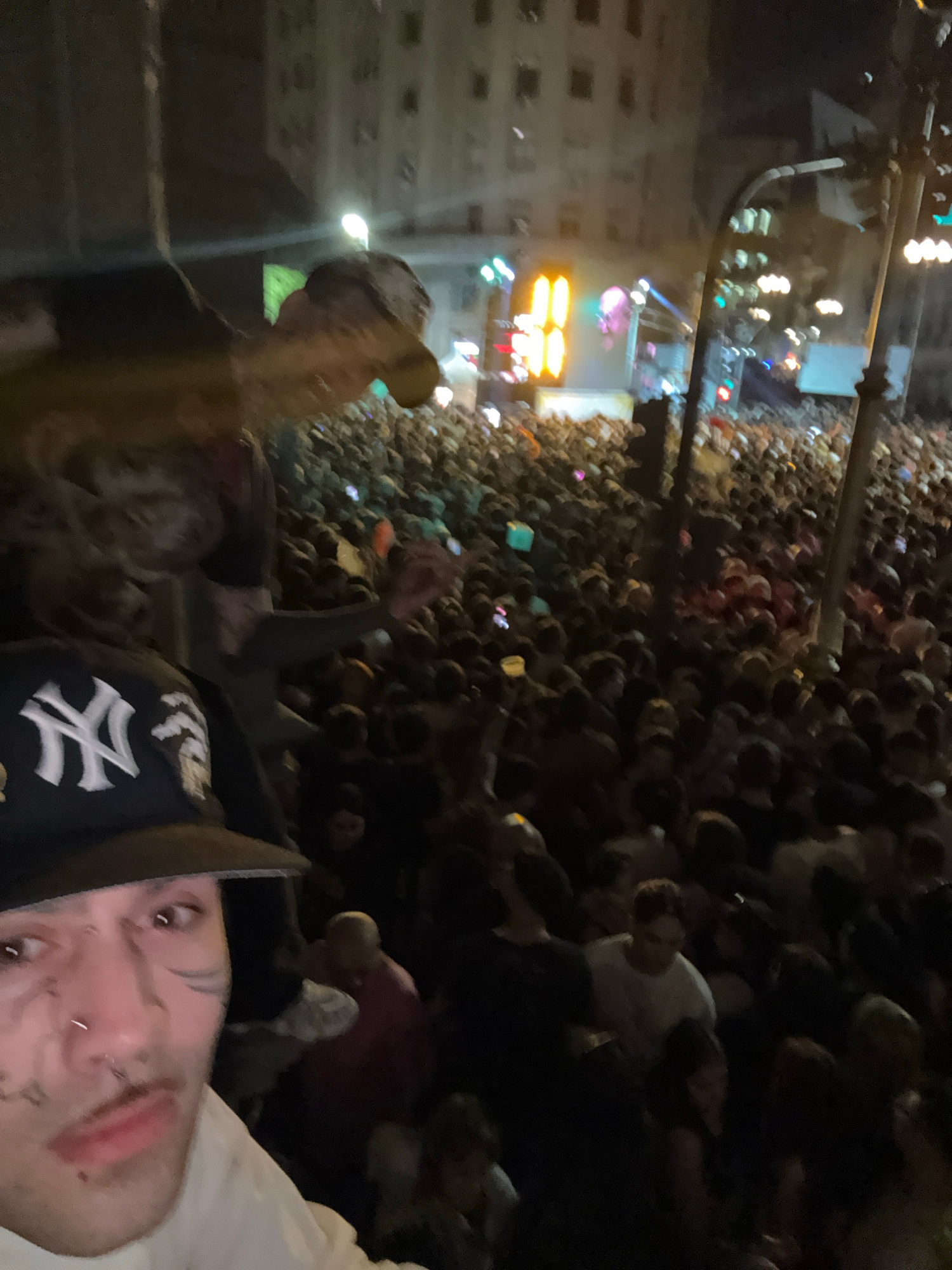 The image shows a large crowd of people at an event, likely a concert or festival, at night in Buenos Aires, Argentina. In the foreground, a person is taking a selfie, wearing a baseball cap with a "Nā¦read more