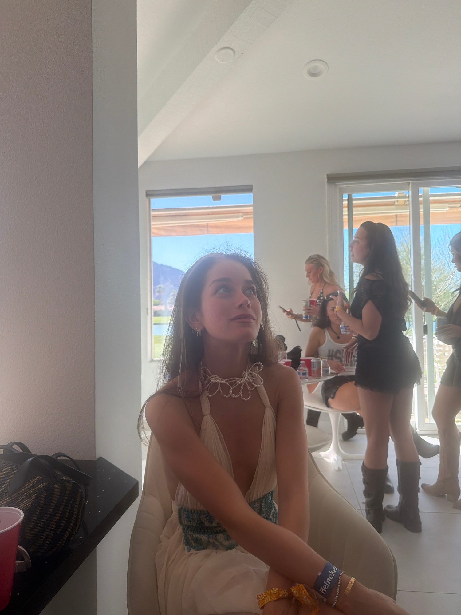 The image shows a group of young women indoors in La Quinta, California. One woman is in the foreground, seated in a chair, wearing a light-colored dress and a beaded necklace. On her wrist are severa…read more