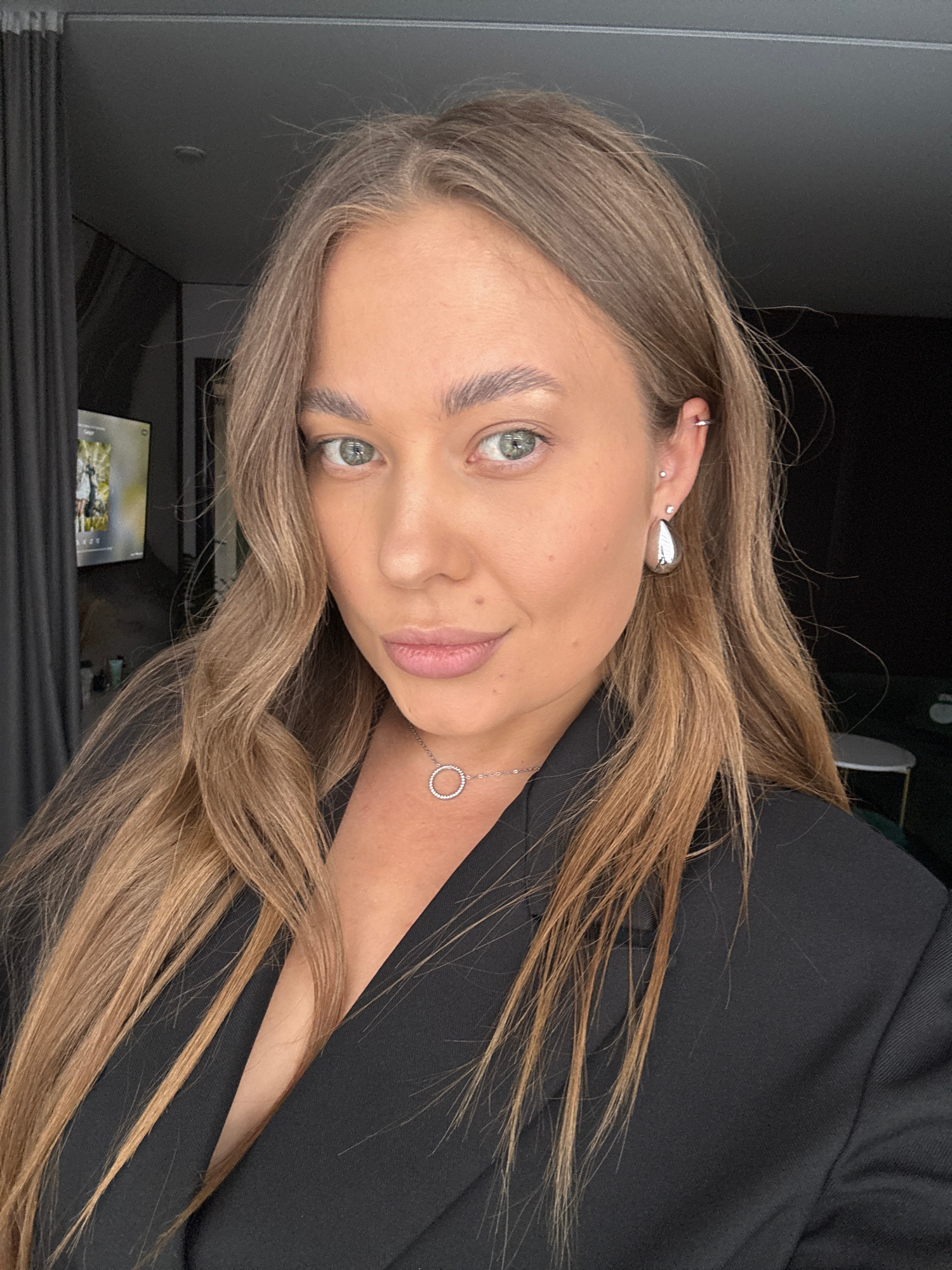 A woman with light brown hair and green eyes is seen in a portrait-style photograph. She is wearing a black jacket and a silver necklace with a circular pendant. She has multiple piercings on her left…read more