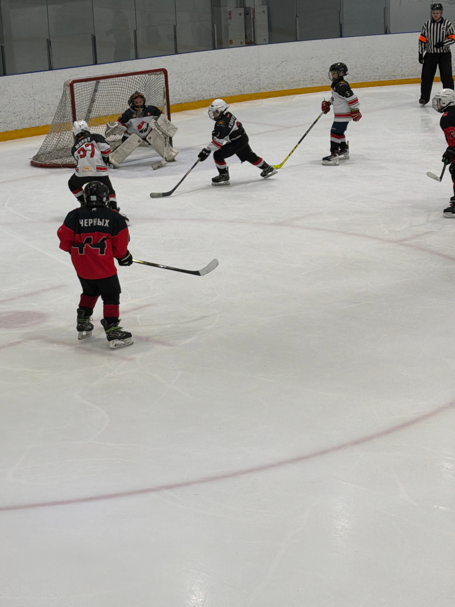 The image shows a youth hockey game in progress on an ice rink. The players, dressed in full hockey gear, are actively engaged in the game near the goal. There's a goalie defending the net. An officia…read more