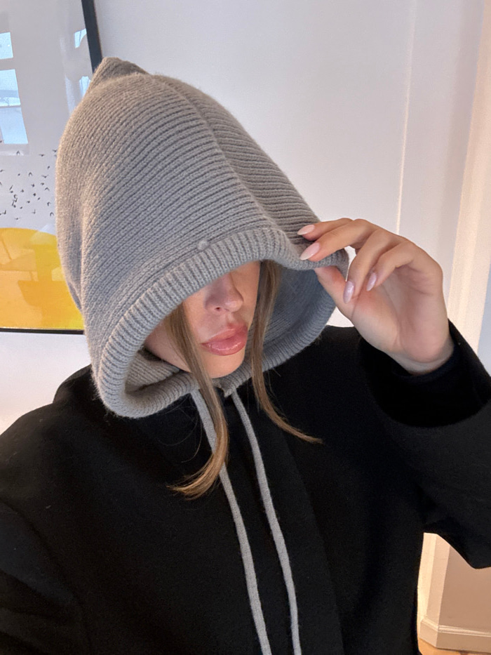 An individual poses indoors within the city of Unknown, Unknown. The subject wears a light grey ribbed knitted hood, pulled forward to obscure the upper face. Below the hood, a black garment with ligh…read more