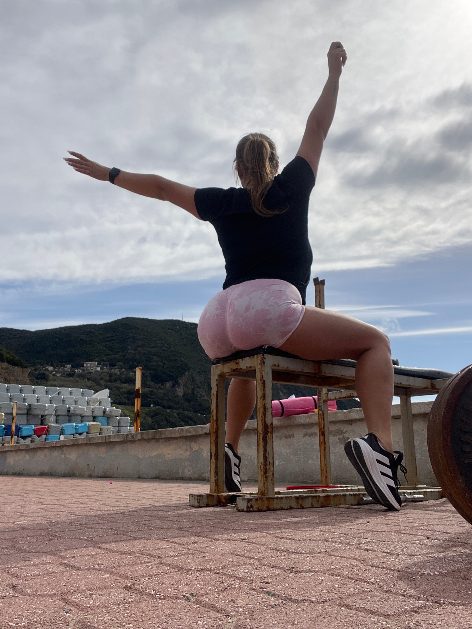 The image depicts a woman performing a gymnastic exercise outdoors. She is suspended on a metal structure, possibly a piece of fitness equipment, with one arm extended upward and the other down for ba…read more