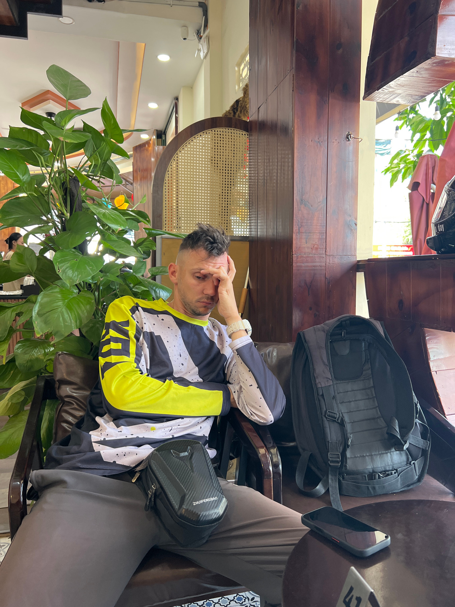 A medium indoor shot depicts a seated Caucasian male, head in hand, wearing a racing jersey with black, white, and yellow panels. He is positioned next to a large leafy plant. A dark backpack sits on…read more