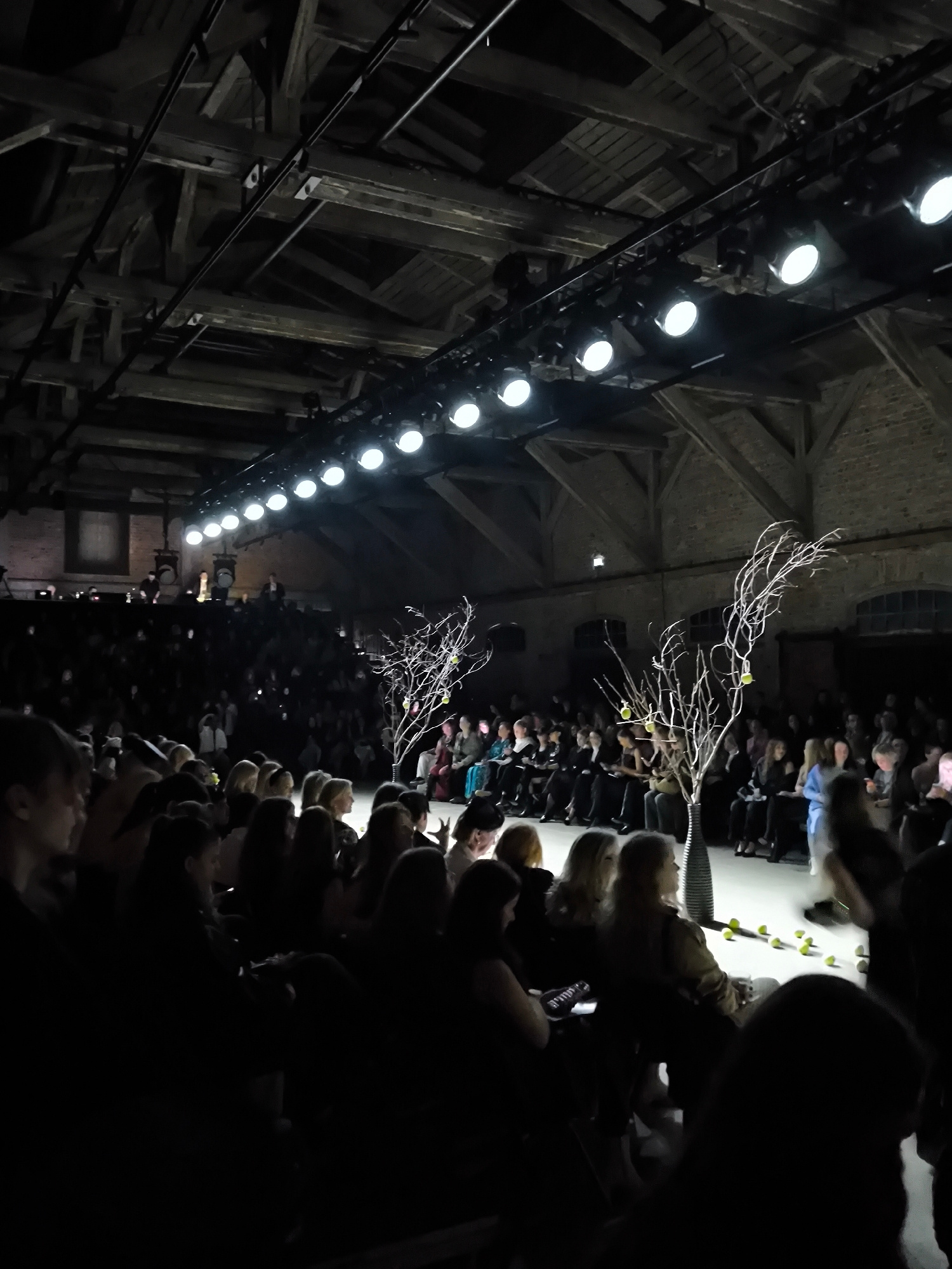 The image captures a fashion show taking place in what appears to be a repurposed industrial space in Riga, Latvia. The high ceiling is supported by wooden beams and illuminated by a series of spotlig…read more