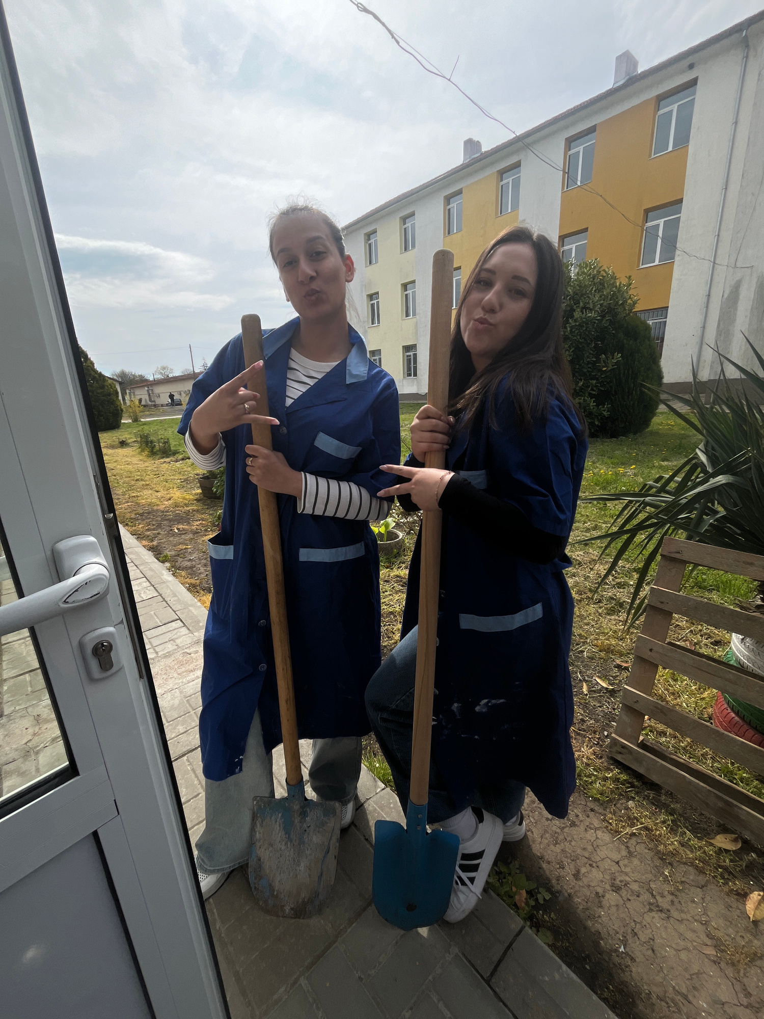 The image, taken in Karnobat, Bulgaria, shows two young women posing outdoors while holding shovels. The scene is presented sideways, rotated 90 degrees clockwise. In the foreground, a white PVC wind…read more