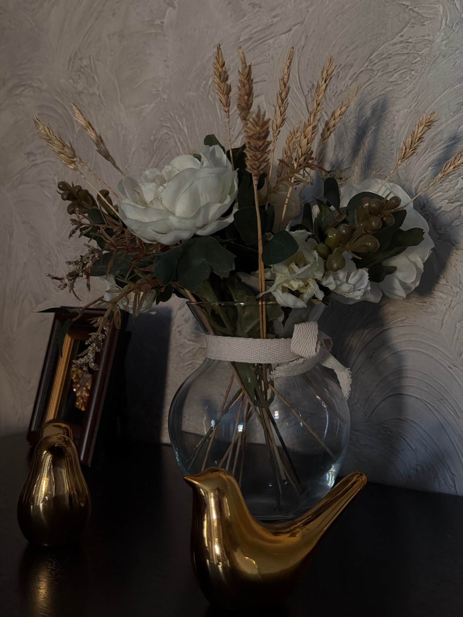The image depicts a floral arrangement in a glass vase with a gold stand, secured with a white cloth ribbon. The arrangement includes white flowers, green leaves, wheat stalks, and berries. The vase i…read more