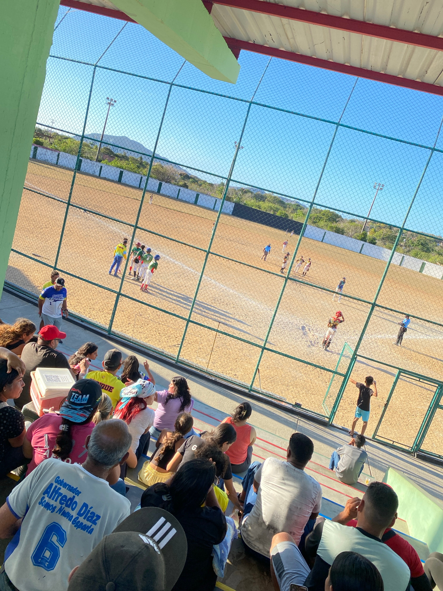 Here is a detailed description of the image: **Location:** The image shows an outdoor baseball field scene, likely in or near Juan Griego, Venezuela. This is based on the text on a shirt. **People:*…read more