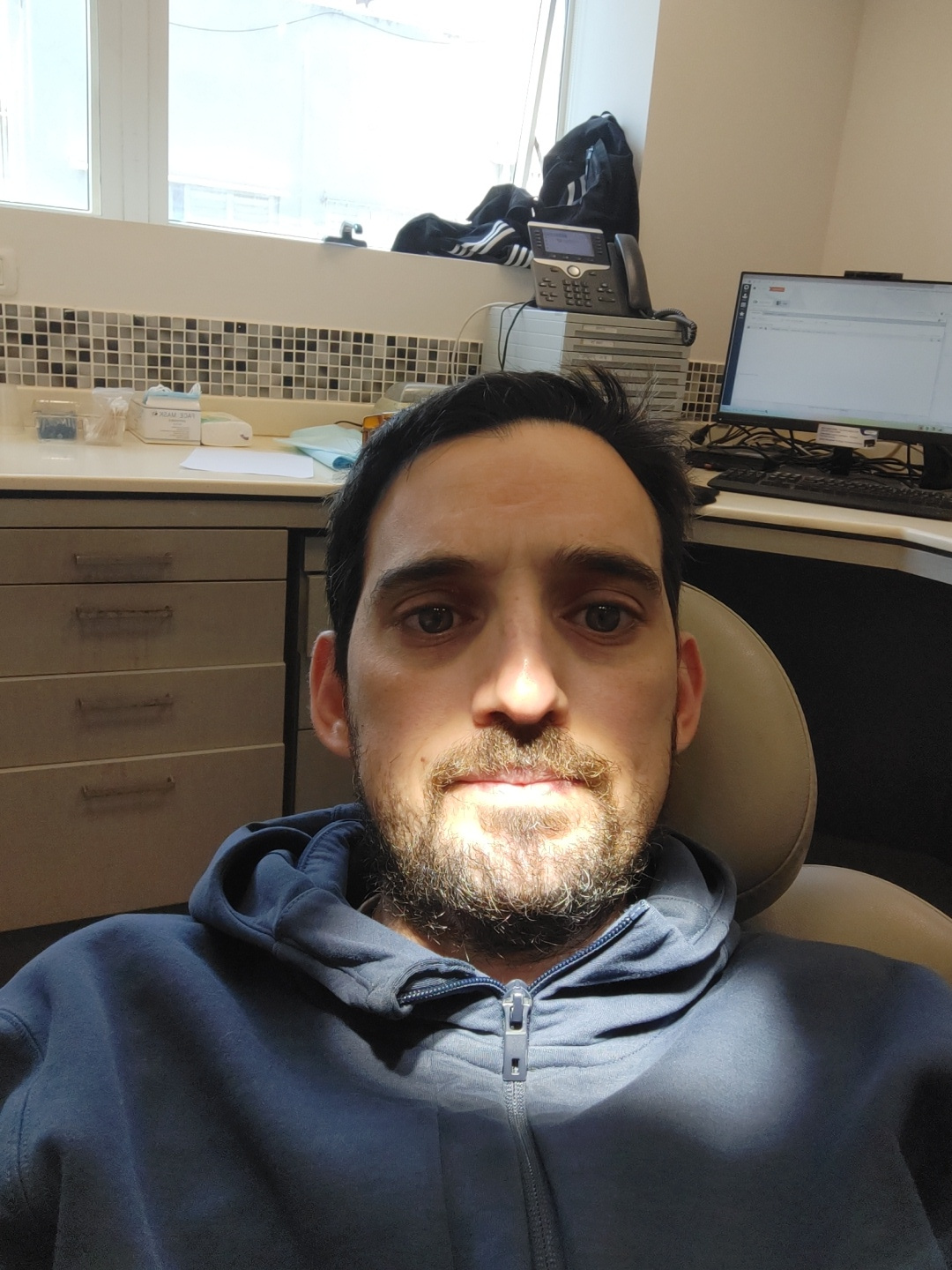 A selfie shot features a man with dark hair and a trimmed beard. He's wearing a zipped-up blue hoodie and seated in what appears to be a beige dental chair. The background includes office elements: a…read more