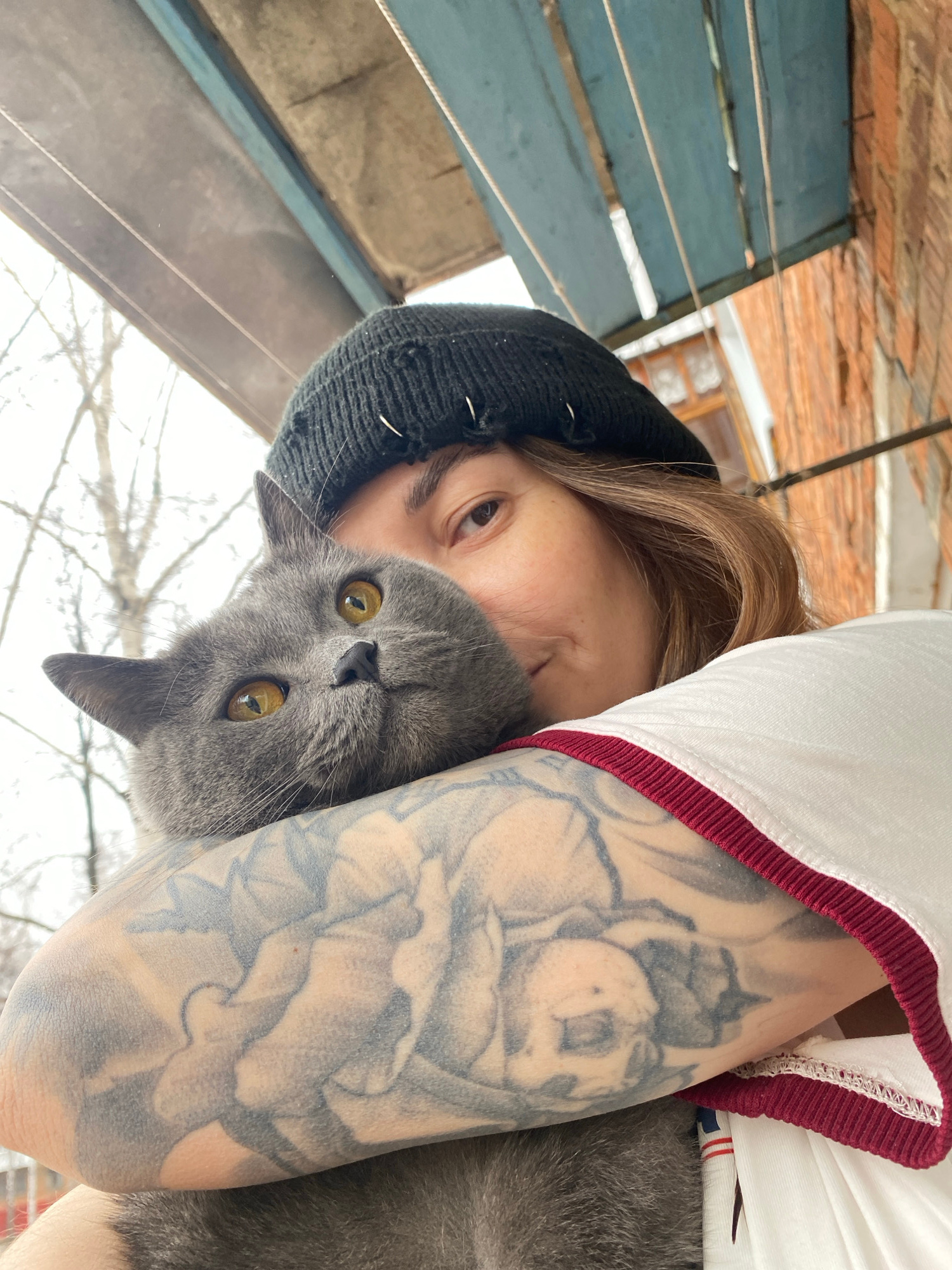 A person with light brown hair and a black beanie is holding a gray cat. The person is wearing a white shirt with a red trim. The person's left arm is visible and has a large floral tattoo. The backgr…read more