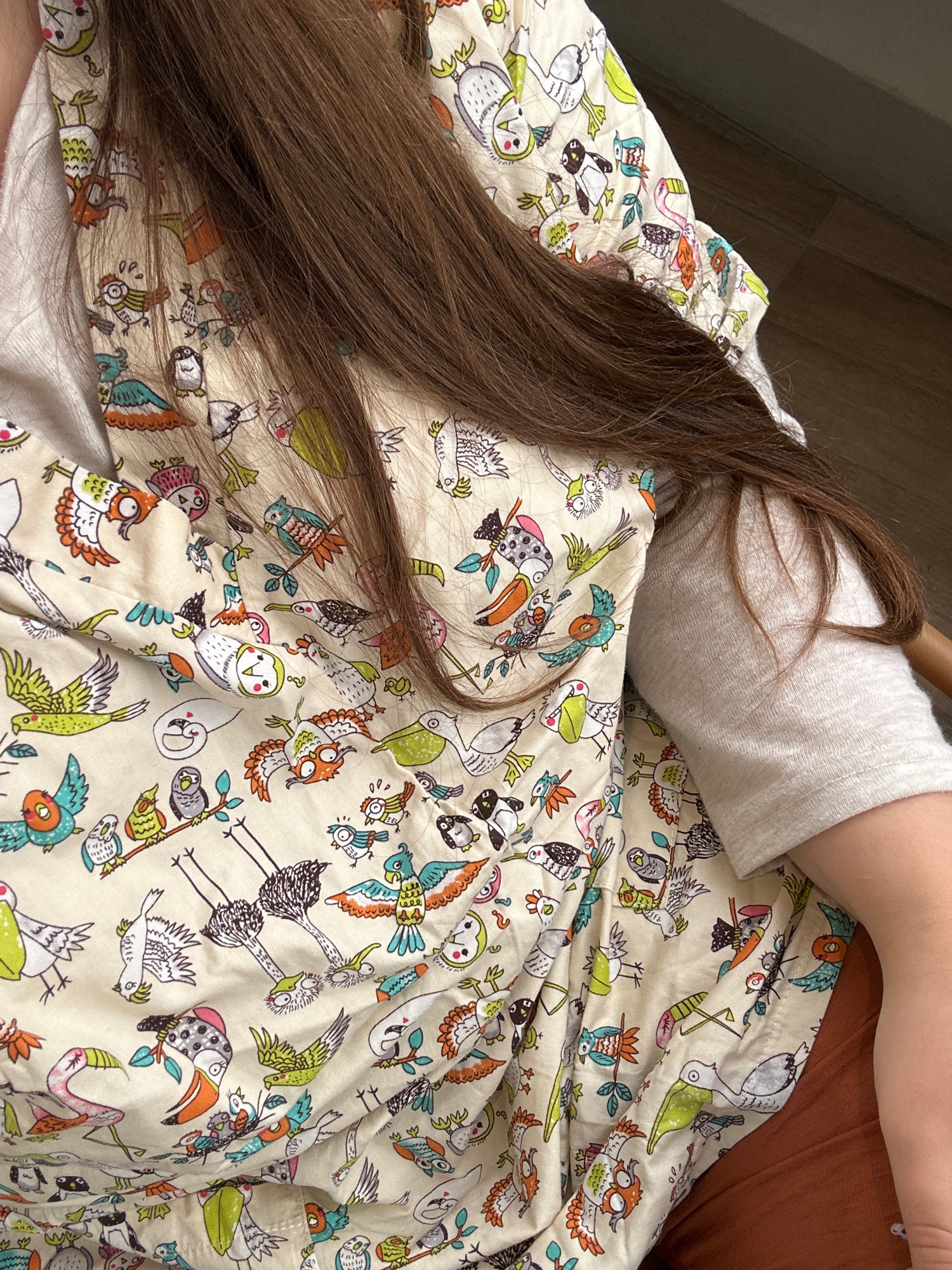 A high-angle shot shows a person lying down, possibly on a bed or cushioned surface. The individual has long brown hair that is spread out. The person is wearing a light-colored top and brown pants. The surface they are lying on is covered with a fabric featuring a pattern of various cartoon-style birds. There is no information available to confirm the presence of this image was taken in Al Jizah, Jordan. | Open Wire
