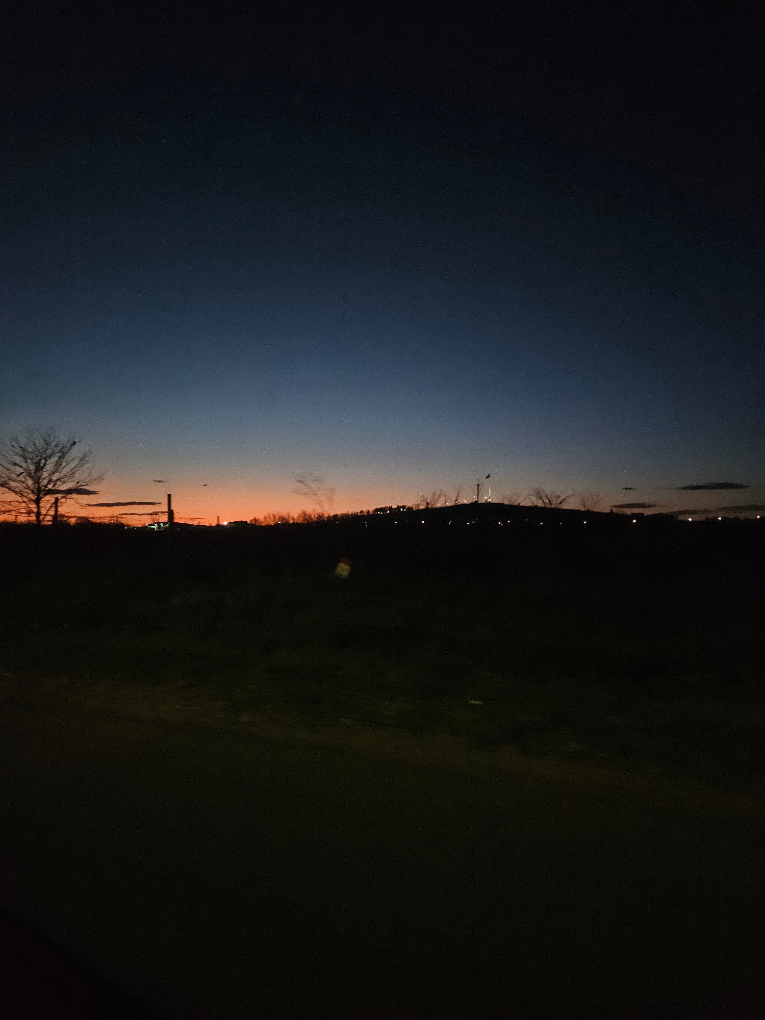 The image captures a landscape during twilight, possibly in Yambol, Bulgaria, with a gradient sky transitioning from dark blue to orange near the horizon. The ground features dark vegetation on the ri…read more