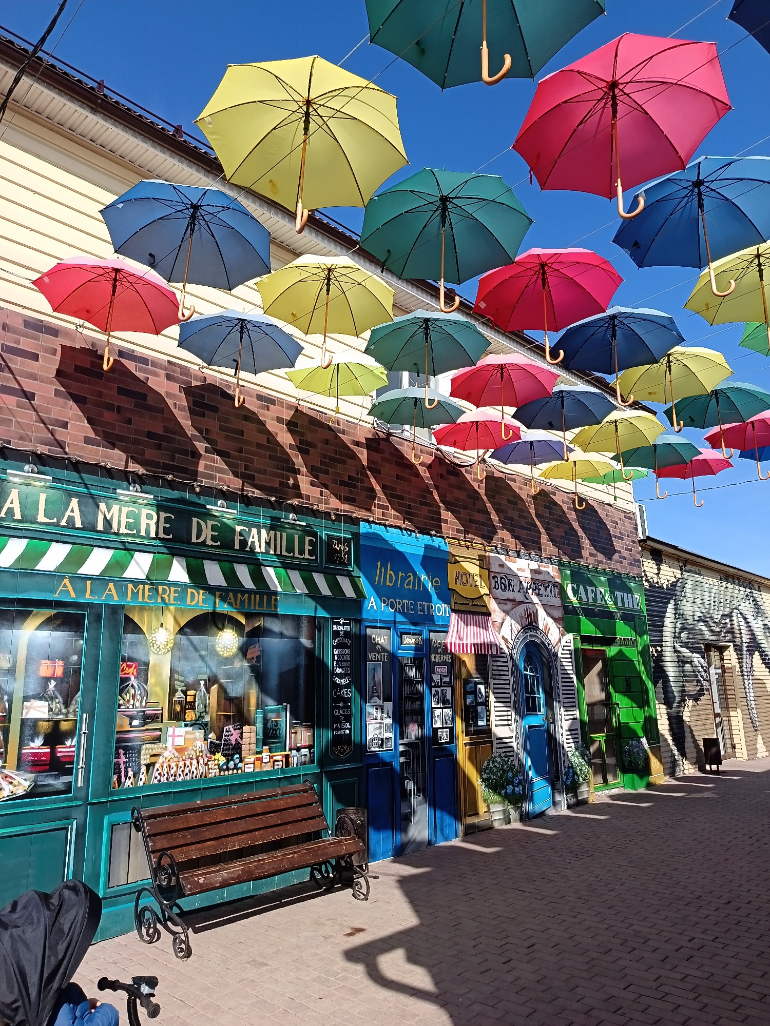 The image captures a vibrant street scene in the city of Osa, Russia. Overhead, a colorful display of numerous suspended umbrellas creates a canopy. Below, the facades of various businesses are painte…read more