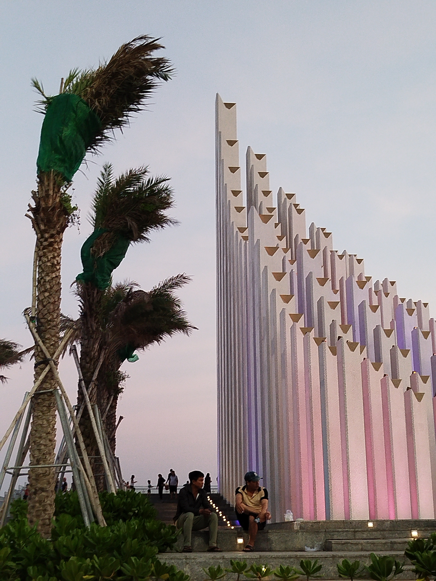 The image captures an outdoor scene in Ho Chi Minh City, Vietnam, featuring a modern architectural structure and people interacting in the environment. The architecture consists of a series of tall,…read more
