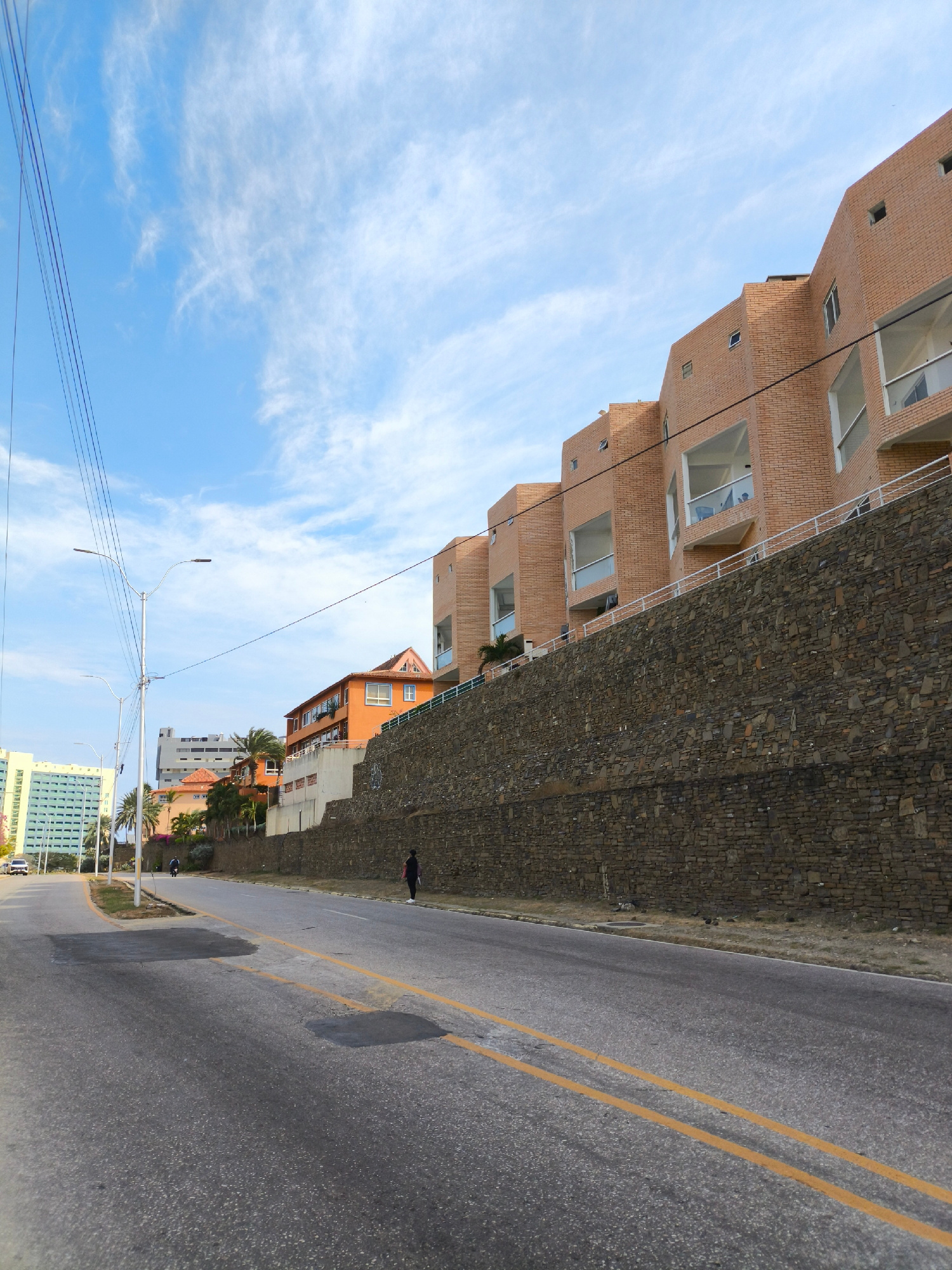 The image shows a street scene in Pampatar, Venezuela, on a day with a clear blue sky with light white clouds. A two-lane road with double yellow lines runs through the frame, showing signs of wear an…read more