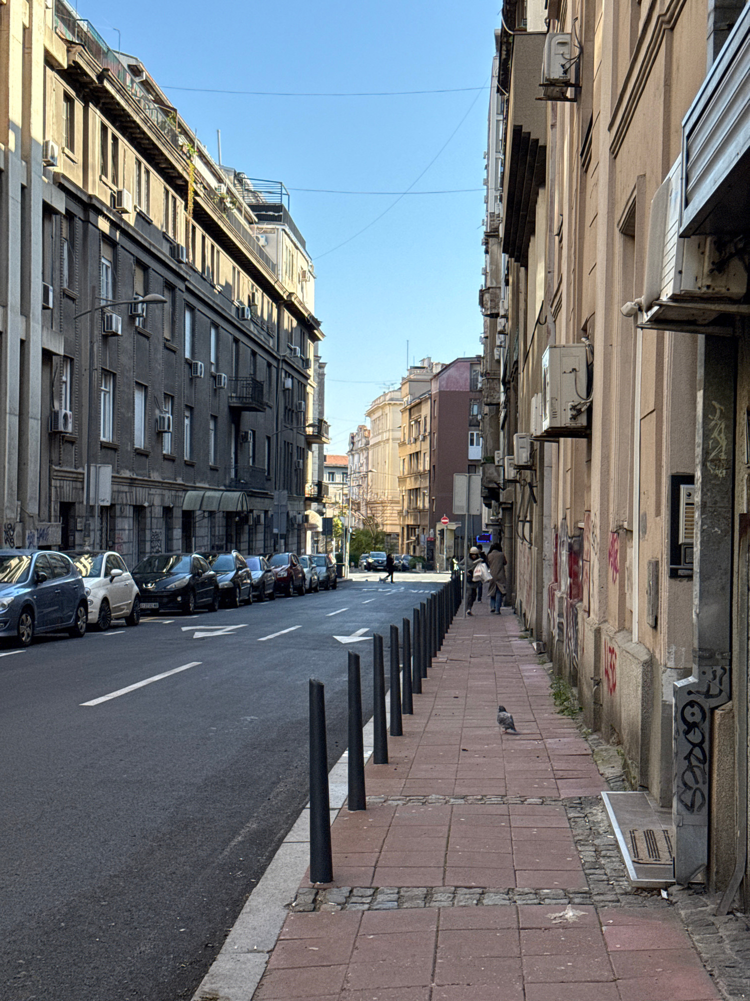 The image captures a street in Belgrade, Serbia. The street is lined with buildings on both sides, varying in height and architectural style. The buildings appear to be older, with signs of wear and t…read more