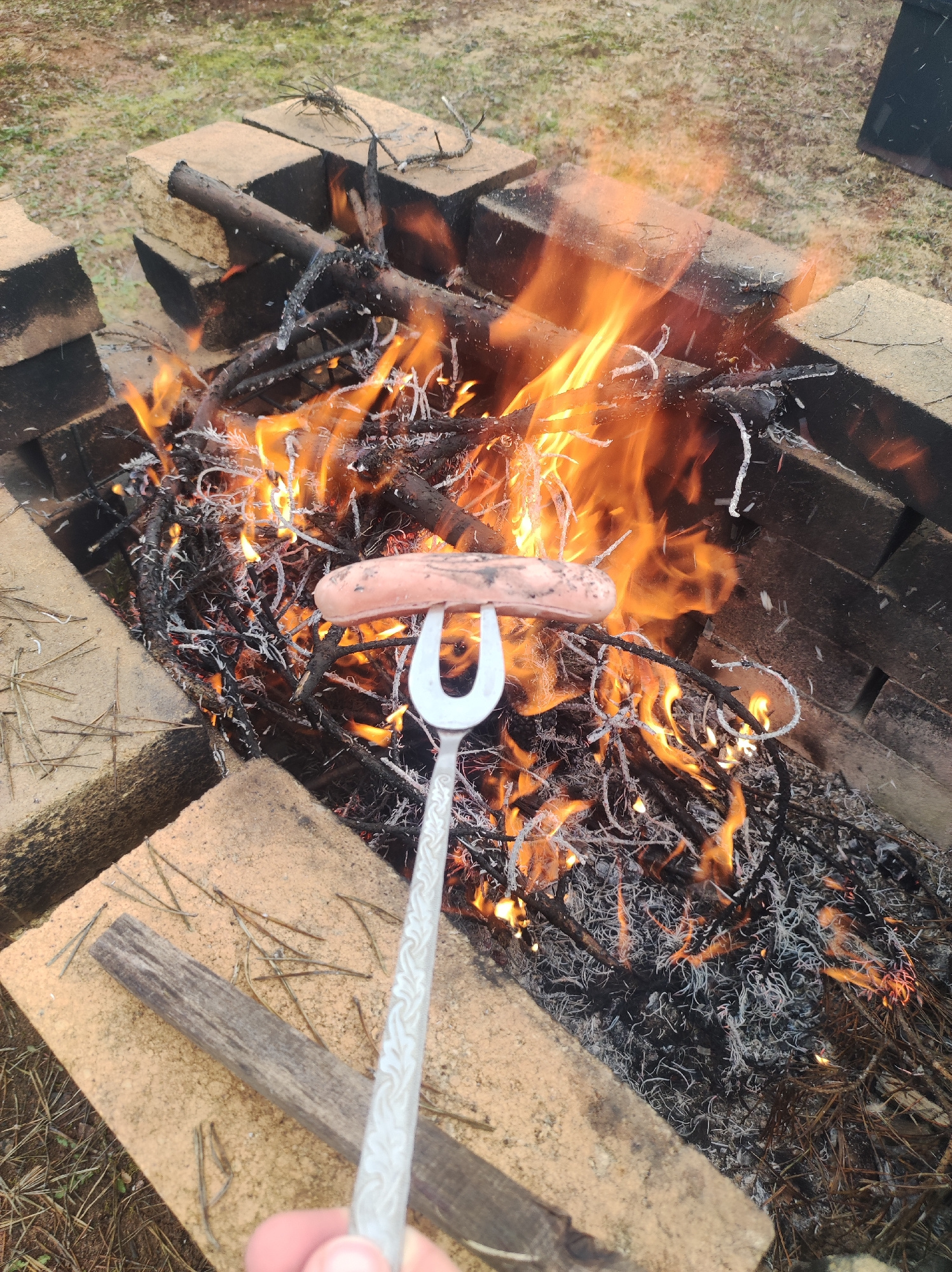 A slightly high-angle outdoor shot focuses on a hot dog impaled on a metal fork, held close to a burning fire. The fire is contained within a makeshift fire pit constructed from light brown bricks. Th…read more