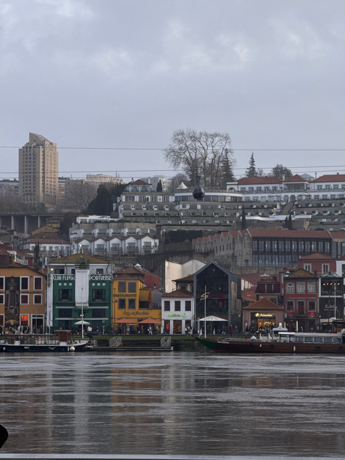 The image depicts a city skyline along a riverbank under an overcast sky. A cable car is visible in the upper left, suspended among bare trees and apartment buildings. Multi-story buildings line the r…read more