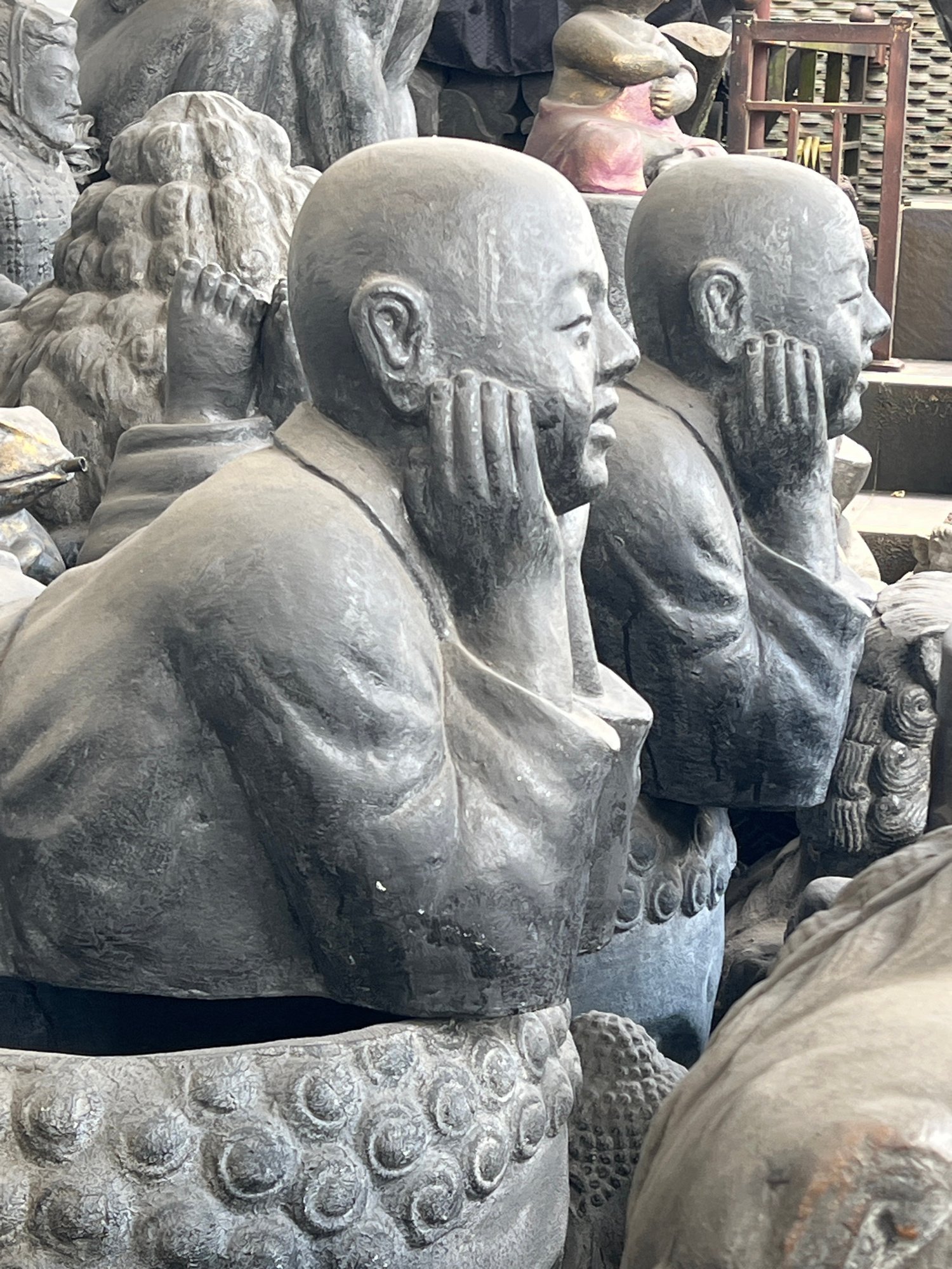 The image captures a dense stack of numerous weathered statues, predominantly depicting male figures made from a gray, stone-like material. In the foreground, two prominent statues are visible: one wi…read more