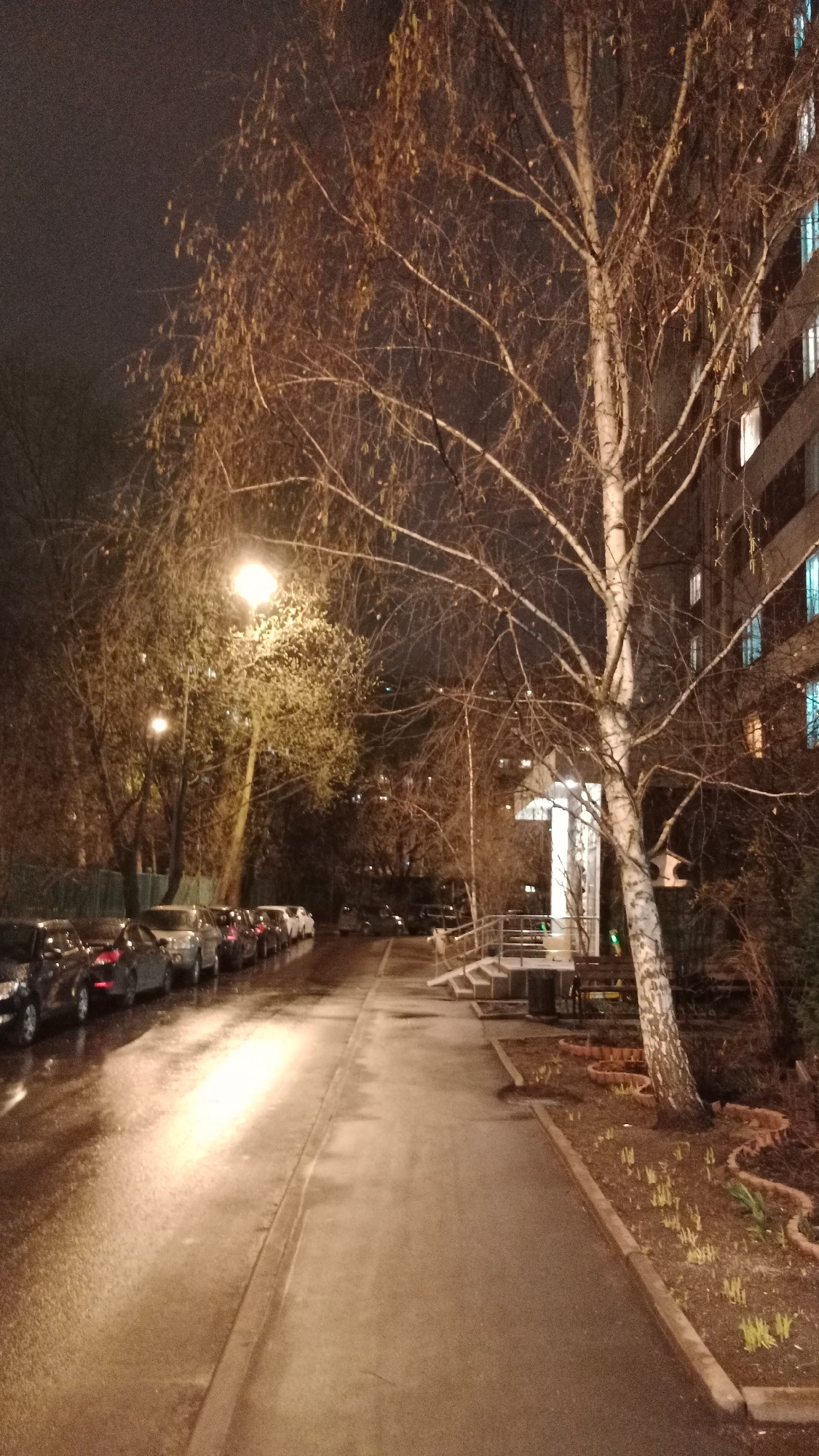 The image depicts a street scene at night in Moscow, Russia. The road is wet, reflecting light from a street lamp. A line of parked cars is visible on the left side of the road. On the right, there is…read more