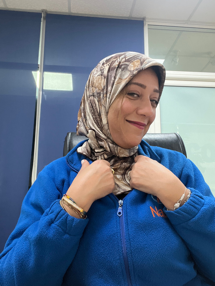 An adult female subject is depicted from the upper chest upward, seated in what appears to be an office environment in Meknes, Morocco. She is wearing a multi-toned patterned hijab, primarily beige an…read more