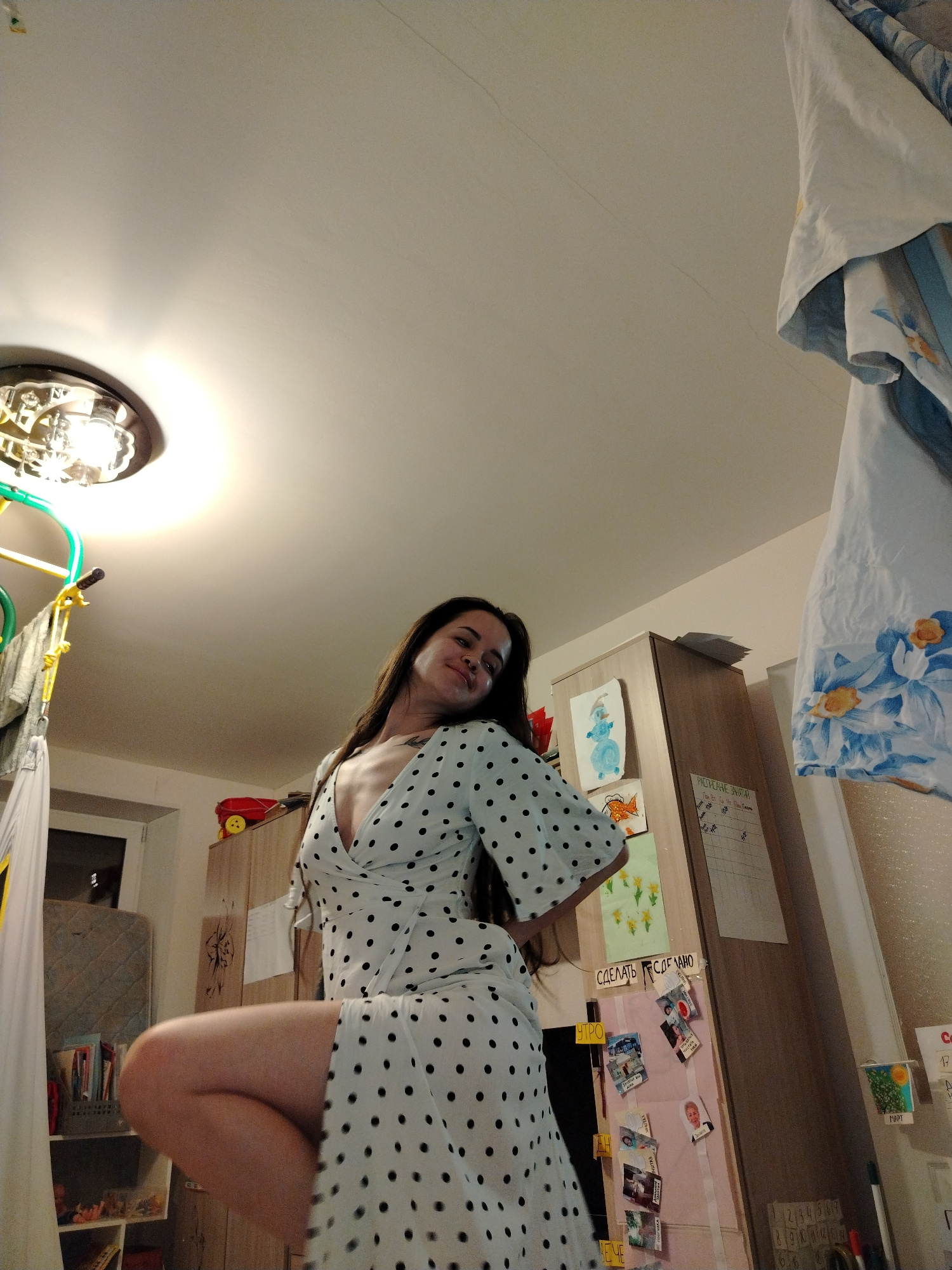 A woman stands in a room with a low-angle perspective. She is fair-skinned and wears a white, knee-length dress with black polka dots, featuring a V-neck. Her long, dark hair is loose. The room inclu…read more