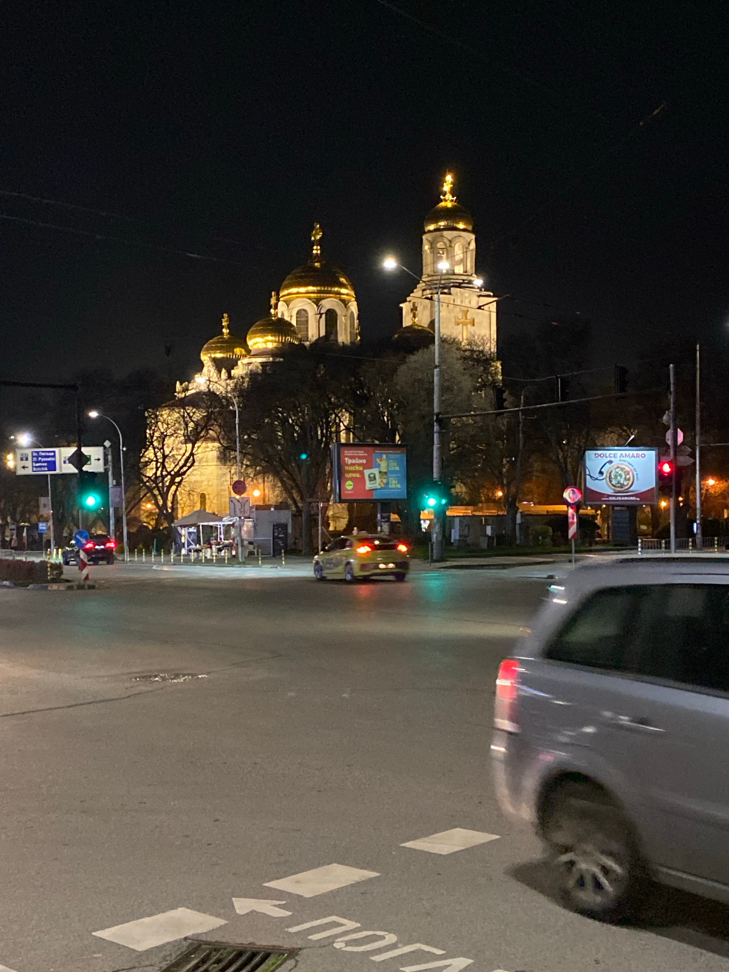 At night, the image shows the Dormition of the Mother of God Cathedral in Varna, Bulgaria, from a street-level perspective. The cathedral, with its illuminated golden domes, stands against the dark sk…read more
