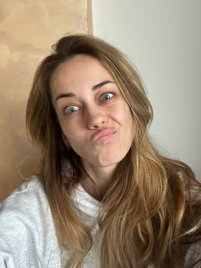 The image displays a close-up portrait of a female subject from the chest up, centered in the frame. She possesses long, wavy light brown hair with blonde highlights, parted on the right side. Her eye…read more