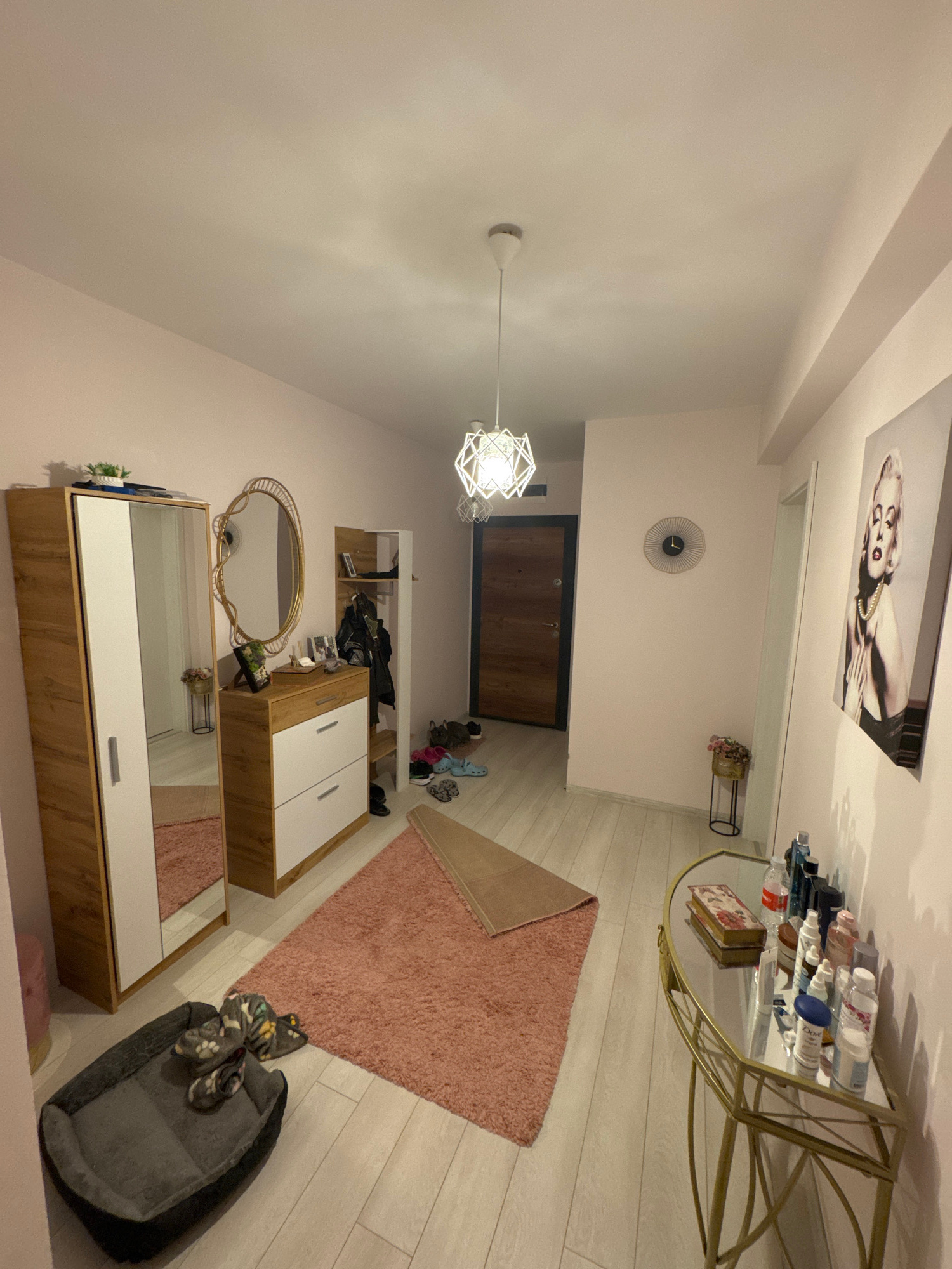 This image depicts an interior space, possibly a hallway or entryway, featuring a combination of furniture and decorative elements. The color palette leans towards light tones, with pink-beige walls.…read more
