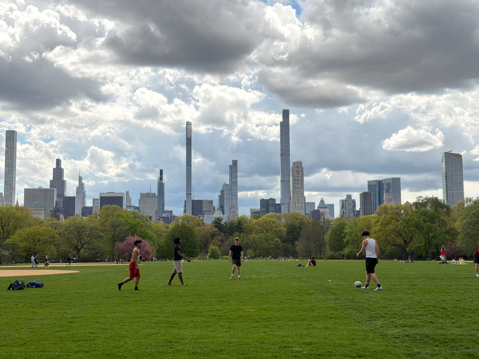 The image depicts a daytime scene in New York City's Central Park. The background shows the city's skyline with numerous skyscrapers under a cloudy sky. In the foreground, a large green lawn is visibl…read more