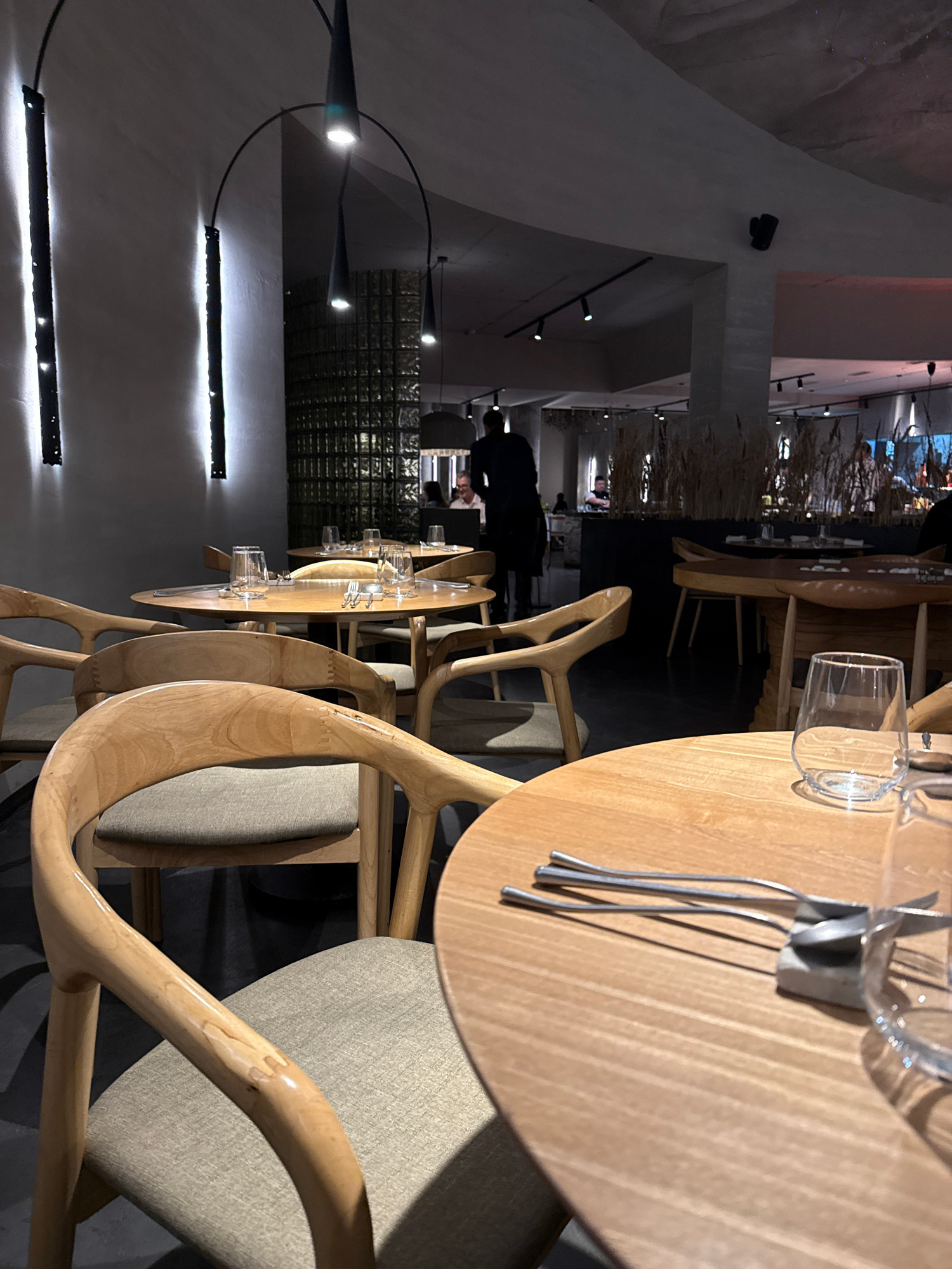 This image captures the interior of a modern and elegantly designed restaurant or dining establishment, likely during the evening due to the dim, atmospheric lighting. The setting suggests an upscale…read more