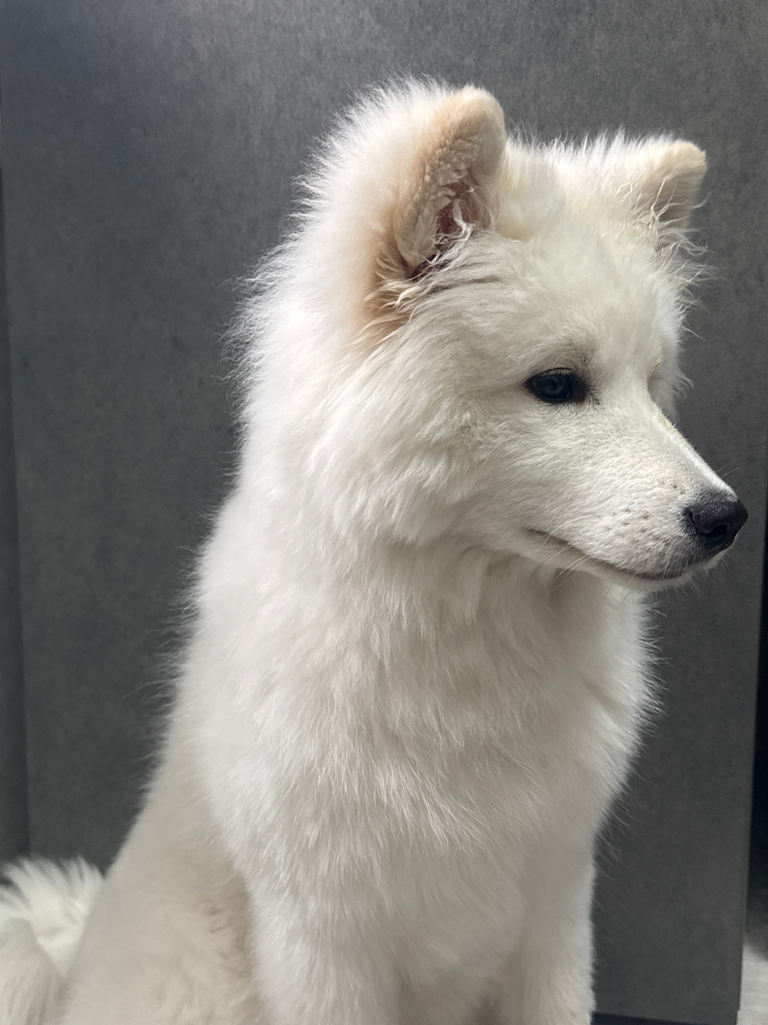 A close-up, eye-level shot depicts a white Samoyed dog. The dog's head and part of its body are visible. The dog is facing to the right and looking upwards. The background is a solid gray color. The d…read more