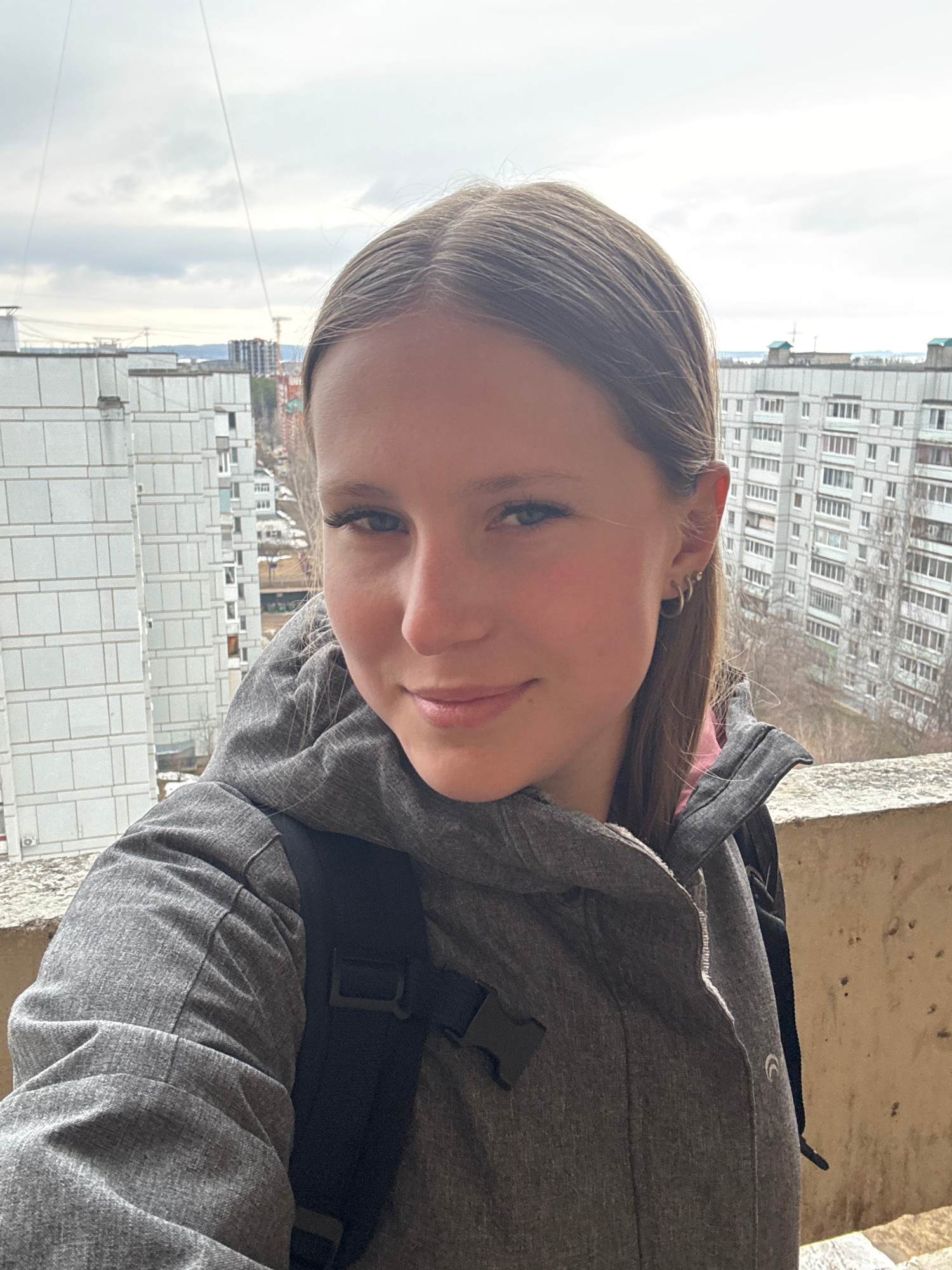 A young woman with light brown hair and blue eyes is taking a selfie. She is wearing a gray hooded jacket and a black backpack. The background shows a cityscape, with apartment buildings. Based on the…read more
