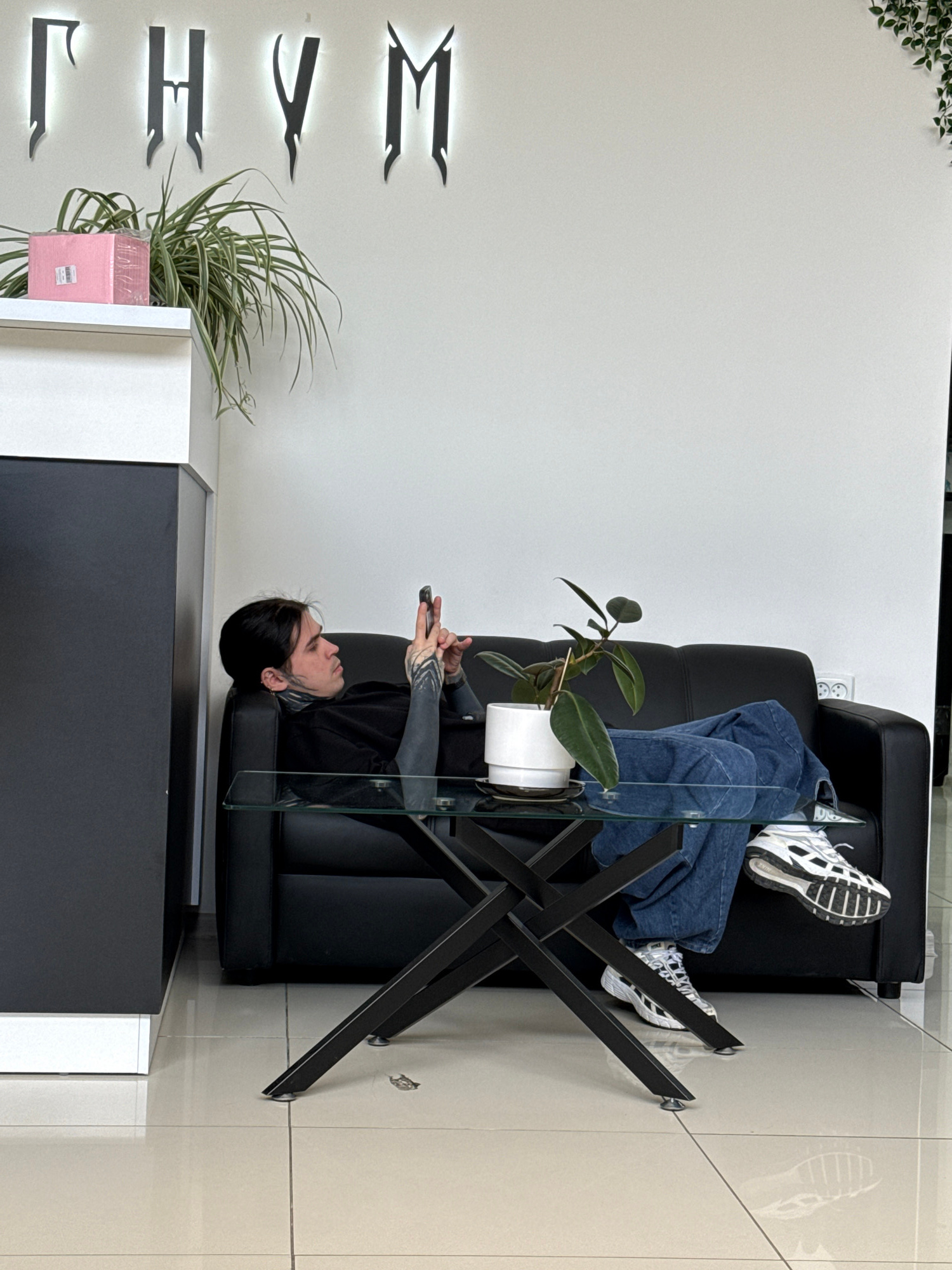 In an indoor setting, a person is seen lying comfortably on a black leather couch, head to the left and feet propped up on the backrest. They are wearing blue jeans and white sneakers with black accen…read more